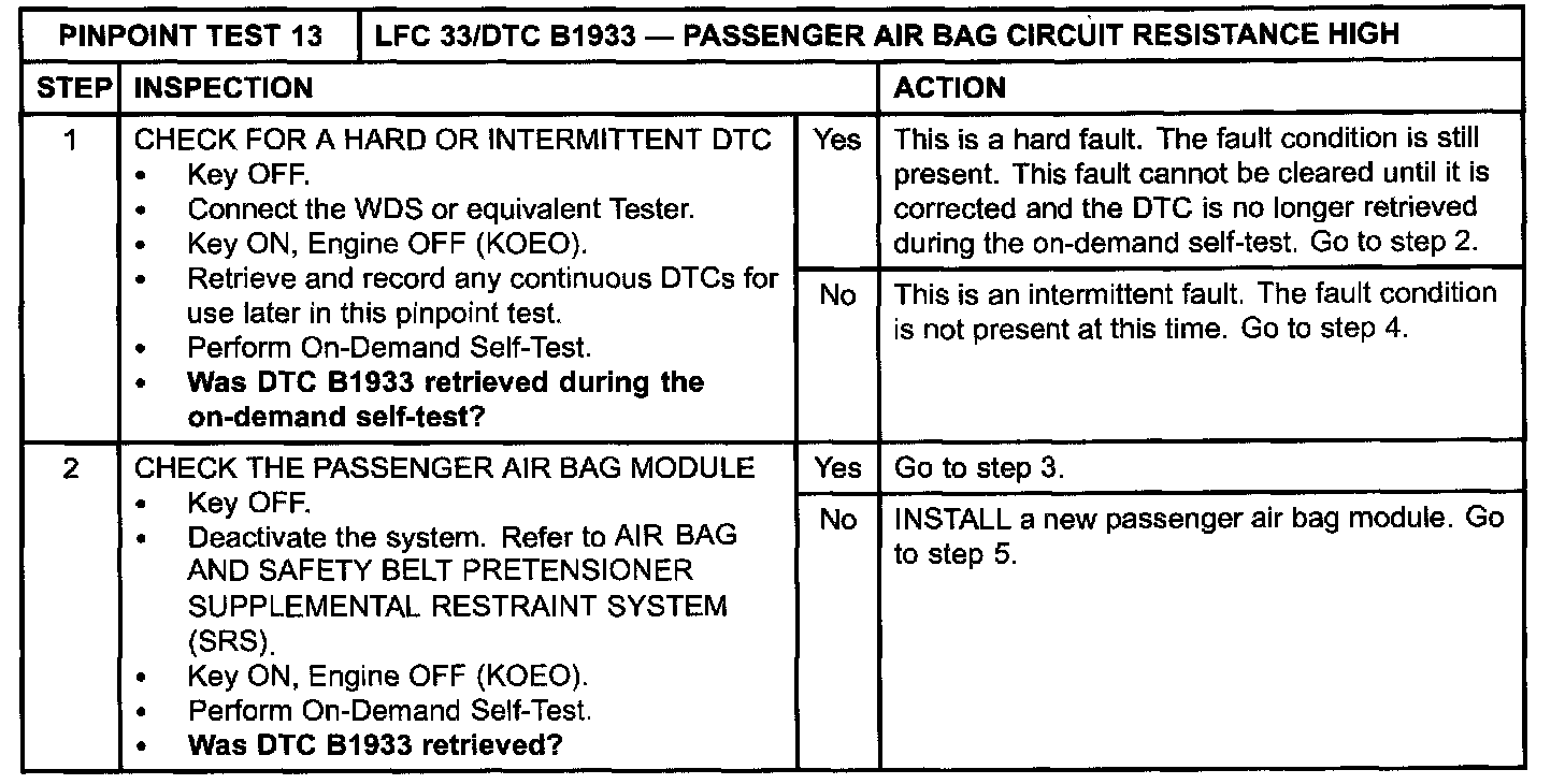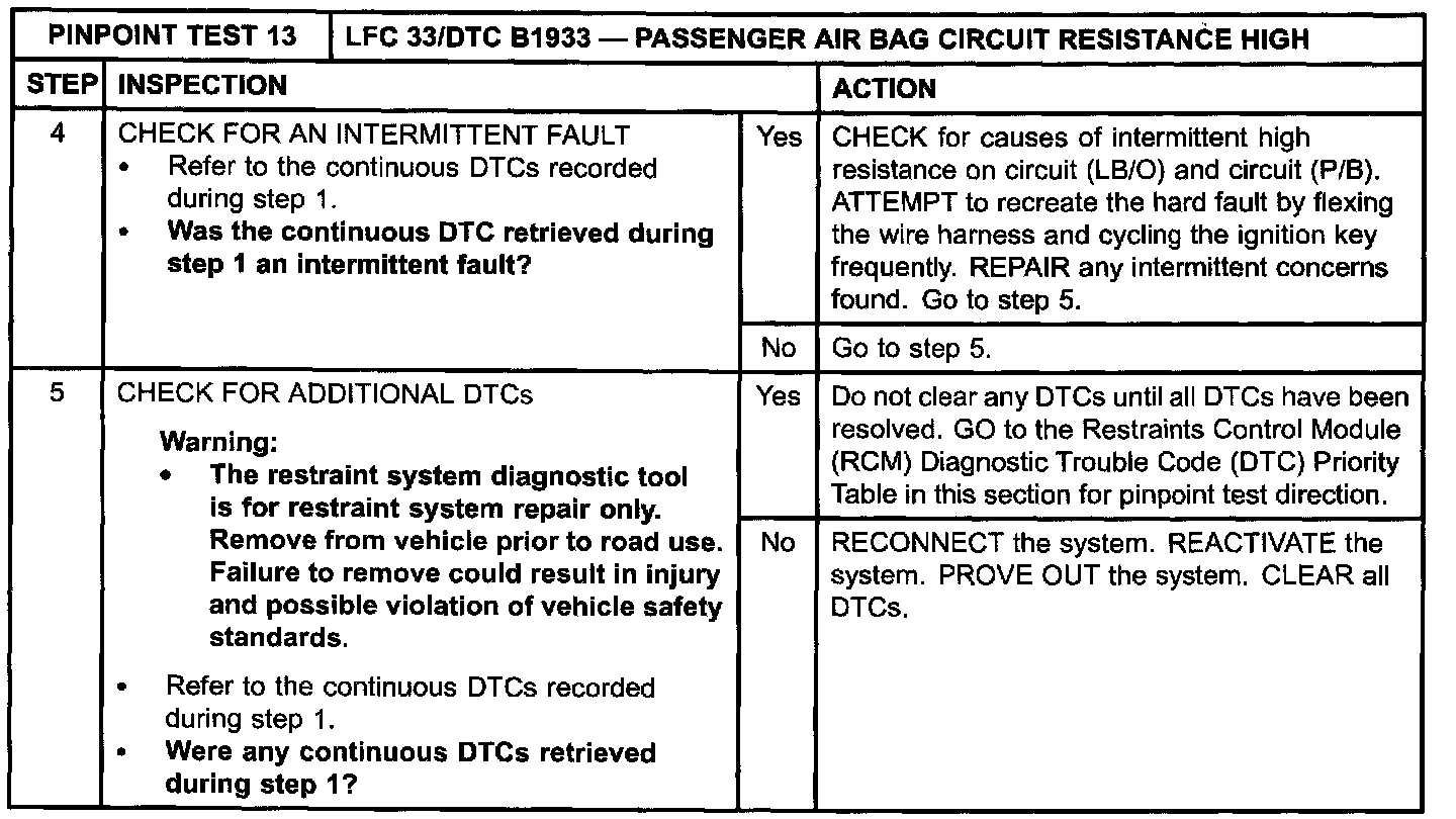 The restraints control module (RCM) monitors the resistance of the passenger air bag ignitor by measuring the resistance between pins 6 and 7. If the RCM detects high resistance between these pins, it will store a diagnostic trouble code (DTC) B1933 in memory and flash a lamp fault code (LFC) 33 (or higher priority code if one exists) on the air bag indicator.