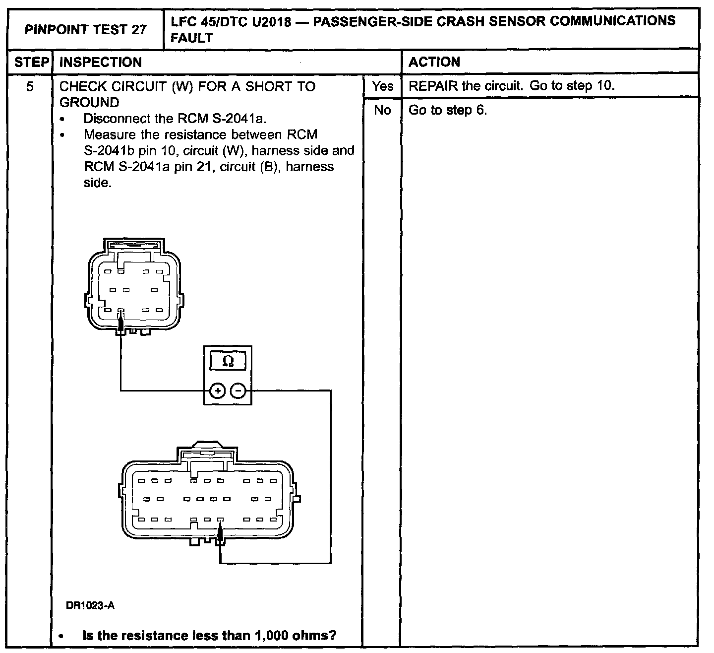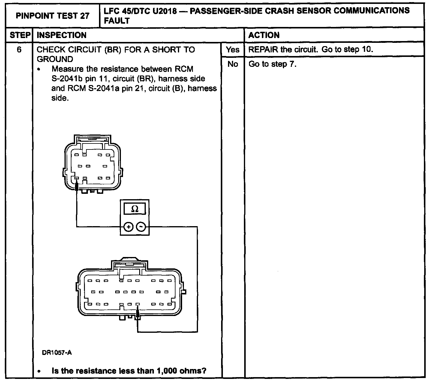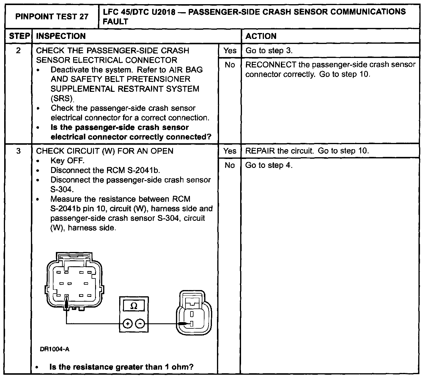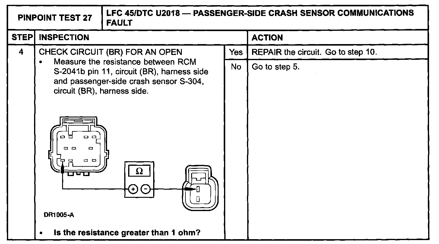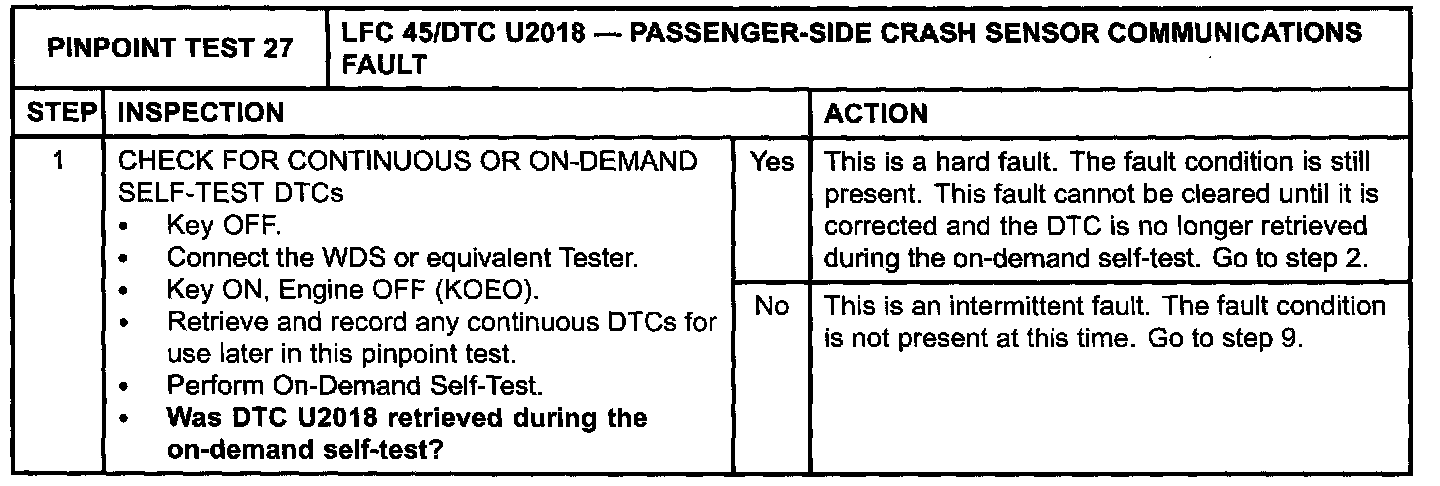 Pinpoint Test 27: LFC 45/DTC U2018 - PASSENGER-SIDE CRASH SENSOR COMMUNICATIONS FAULT