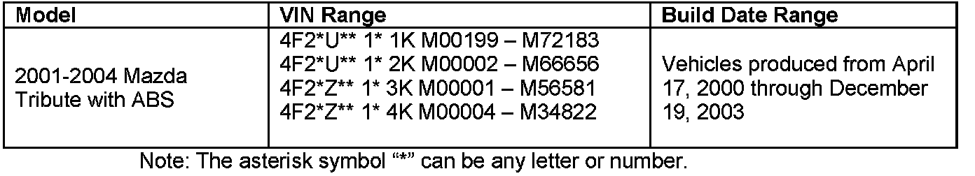 On certain 2001-2004 Mazda Tribute vehicles the Anti-Lock Brake System (ABS) module connector may have missing or dislodged wire seals. This condition could allow contamination to enter the module connector creating a potential for an electrical short. An electrical short might cause an ABS malfunction that would illuminate the ABS warning light and in some cases the module may overheat resulting in burning odor smoke and/or fire. This condition could occur either when the vehicle ignition switch is in the off position or while the vehicle is being operated.