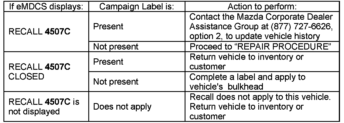 2. Perform a Warranty Vehicle Inquiry using your eMDCS System and inspect vehicle for an Authorized Campaign Label RECALL 4507C attached to the vehicle's bulkhead.