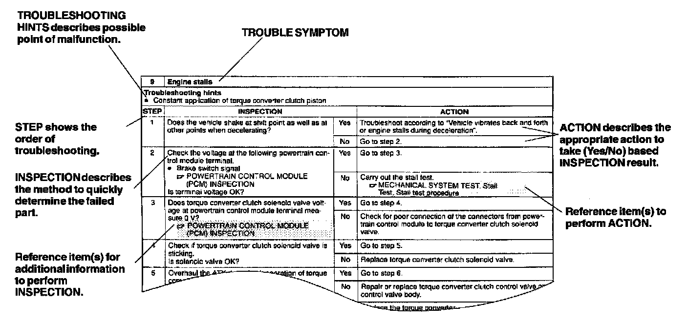 Symptom troubleshooting shows diagnostic procedures, inspection methods, and proper action to take for each trouble symptom.