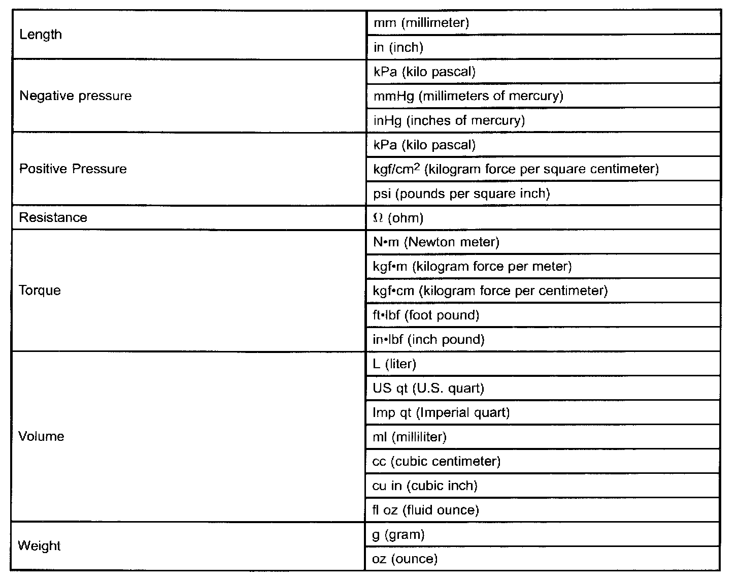 All numerical values in this manual are used on SI units. Numbers shown in conventional units are converted from these values.