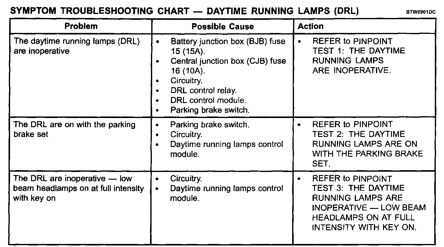 Symptom Troubleshooting Chart - Daytime Running Lamps (DRL):