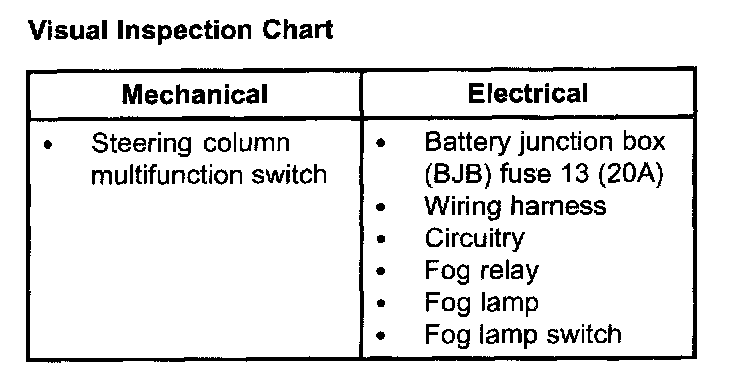 3. If the fault is not visually evident, verify the symptom and proceed to SYMPTOM TROUBLESHOOTING CHART - FOG LAMPS. Symptom Related Diagnostic Procedures