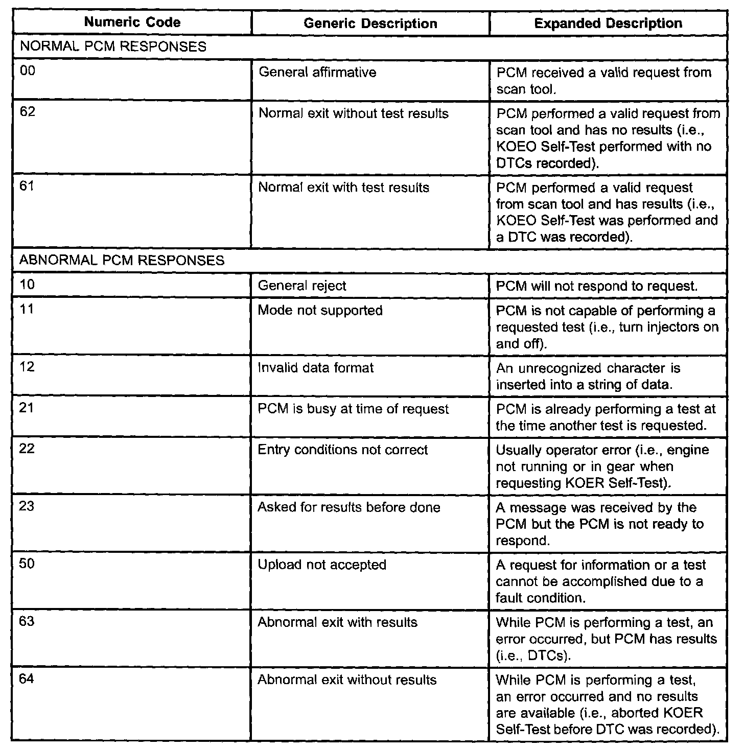 It is possible to receive a communication error from a WDS or equivalent when initiating a diagnostic test or accessing PIDs. The communication error can be caused by operator error, the vehicle wiring, connectors, the PCM or other control modules connected to the DLC wiring. The PCM will respond to a WDS or equivalent whenever the tool requests a test. These are not DTCs. Listed are numeric codes and generic descriptions that a scan tool may display when trying to perform some PCM operations. It is possible to get other numeric codes not listed. For a complete list of communication response codes, Refer to Society of Automotive Engineers (SAE) document J2190 enhanced E/E Diagnostic Test Modes. Some are normal responses to valid requests. The others are communication error responses. If the tool displays any of the communication error responses check scan tool connections, cable/adapters and entry of vehicle information.
