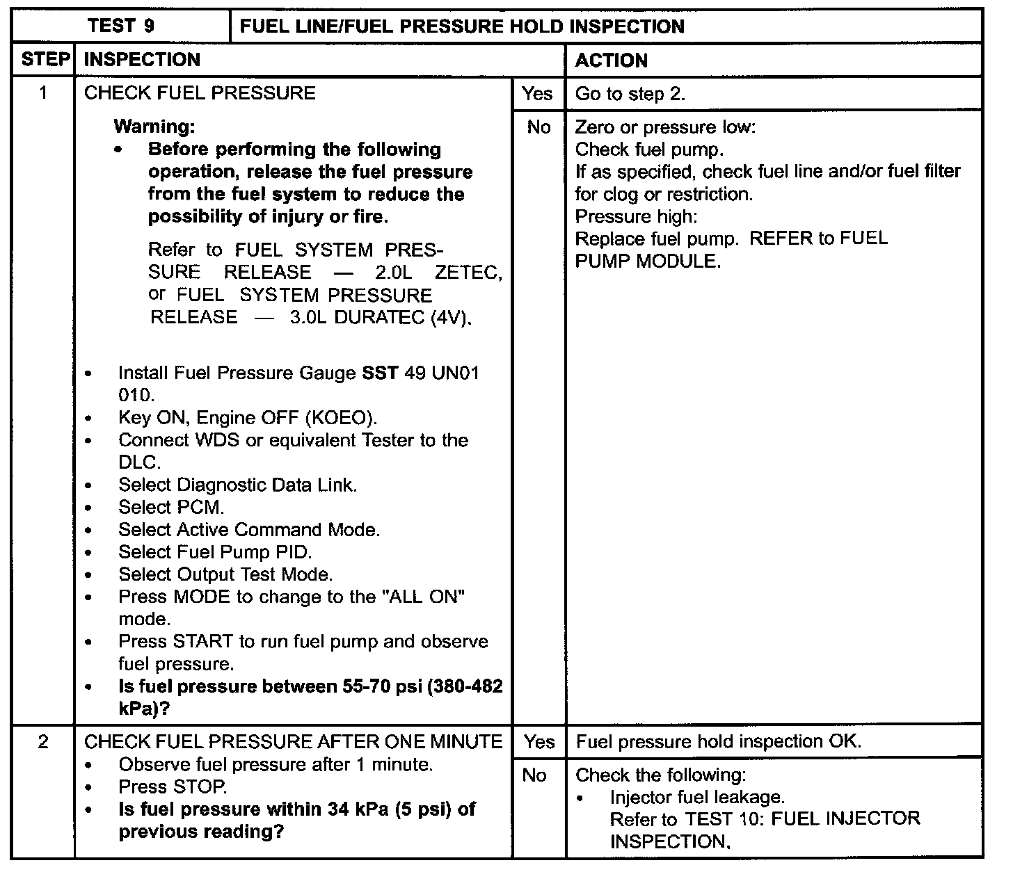 Test 9: Fuel Line/Fuel Pressure Hold Inspection