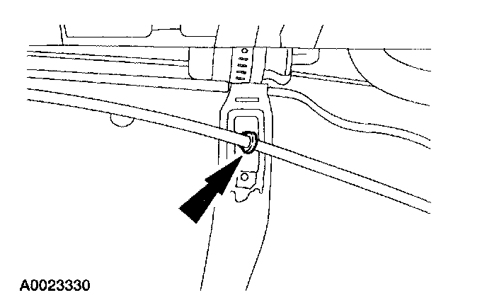 3. Disconnect the pin-type retainer from the fuel tank strap and position the parking brake cable aside.