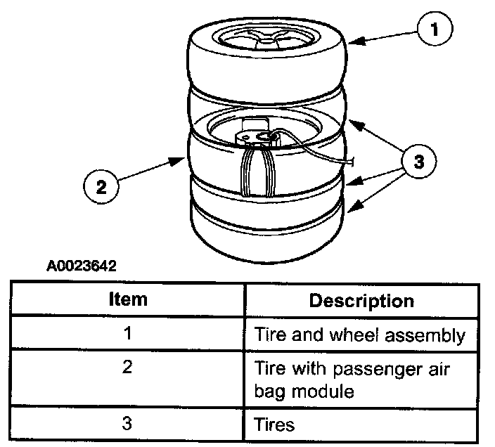 6. Stack three tires, one wheel and tire assembly and the passenger air bag module as shown.
