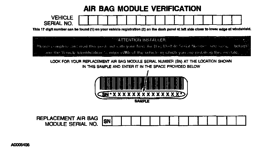 NOTE: When installing a new air bag module, a prepaid return postcard is provided with the replacement air bag module. The serial number for the new part and the vehicle identification number (VIN) must be recorded and sent to Mazda Motor Corporation.