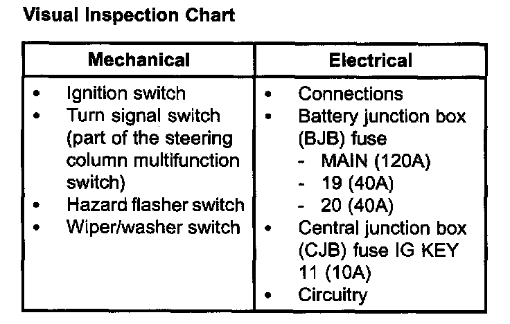 2. Visually inspect the ignition switch and the steering column multifunction switch for damage; refer to the chart.