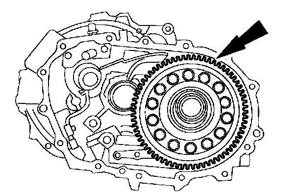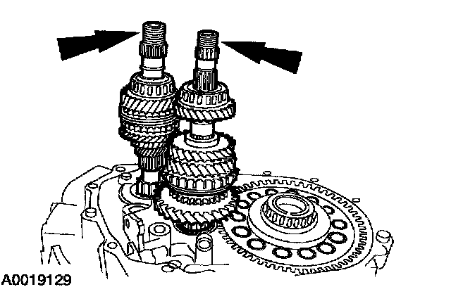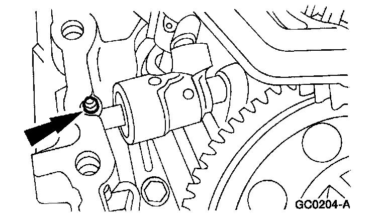 ^ Whenever the transaxle has been disassembled, the bearing preload must be adjusted. The input shaft, output shaft and differential bearing preload can be adjusted by selecting shims to insert between the bearing races and the case on the case side.