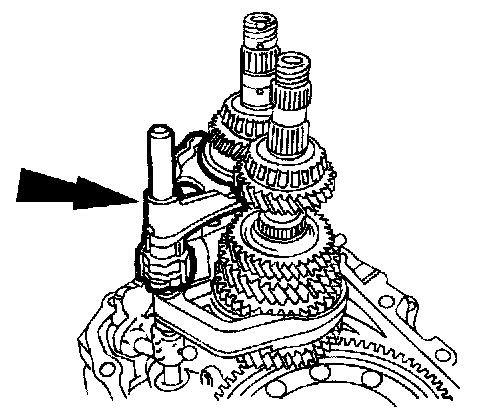 74. Install the fifth/reverse shift fork and synchronizer hub assembly.