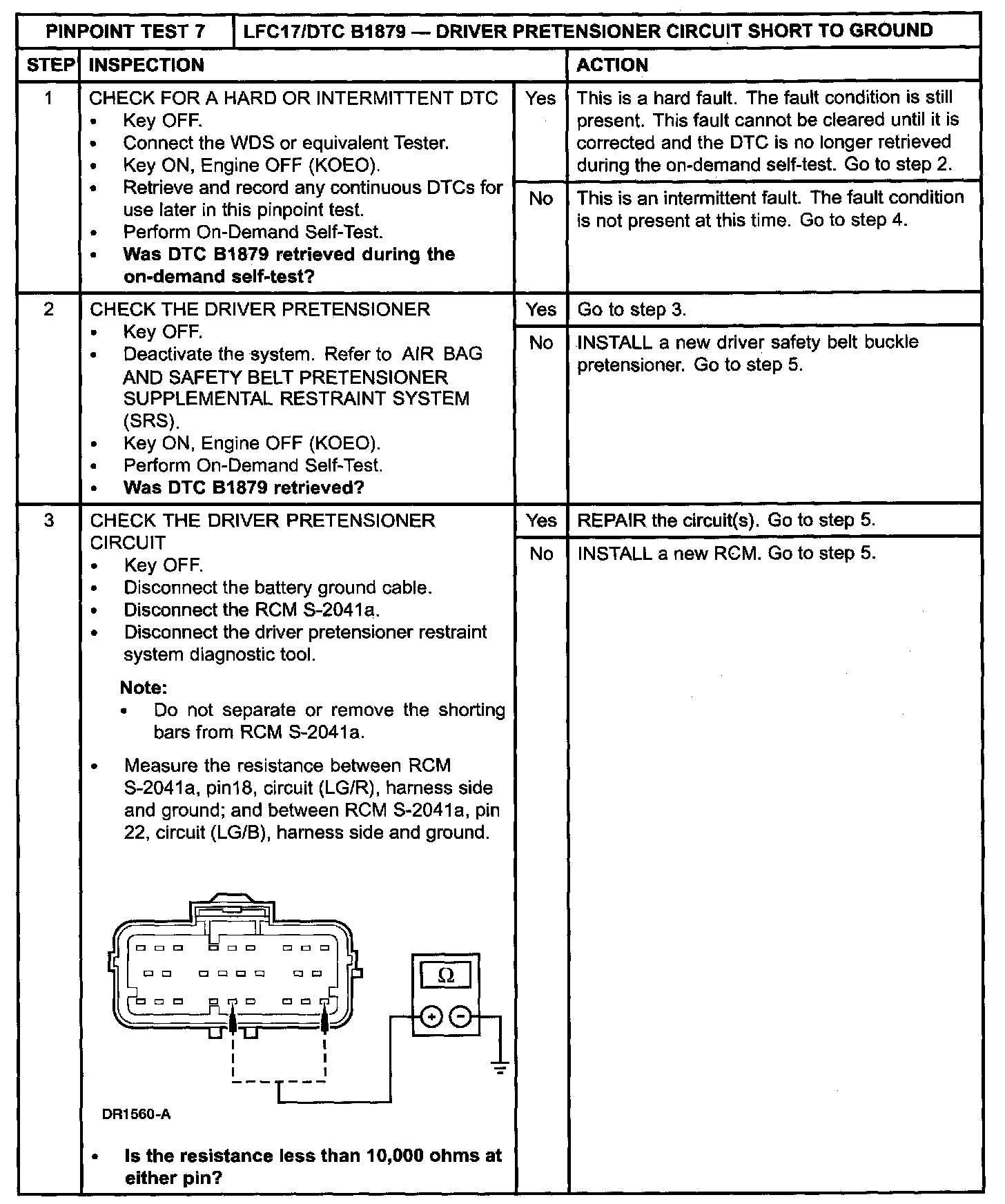 The restraints control module (RCM) monitors the circuit to the driver seat belt buckle pretensioner. When the RCM detects a circuit short to ground it will set lamp fault code (LFC) 17 and diagnostic test code (DTC) B1878.