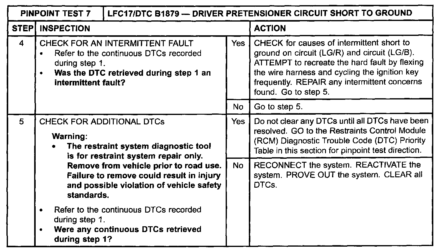 Pinpoint Test 7: LFC 17/DTC B1879 - DRIVER PRETENSIONER CIRCUIT SHORT TO GROUNDNormal Operation