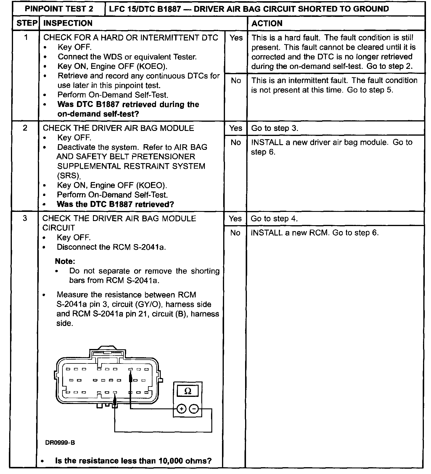 The restraints control module (RCM) checks for driver air bag circuit shorts to ground by monitoring the voltage of circuits (GY/O) and (GY/W) at pins 3 and 4. If the RCM detects a short to ground on either of these pins, it will store a diagnostic trouble code (DTC) B1887 in memory and flash a lamp fault code (LFC) 15 (or higher priority code if one exists) on the air bag indicator.
