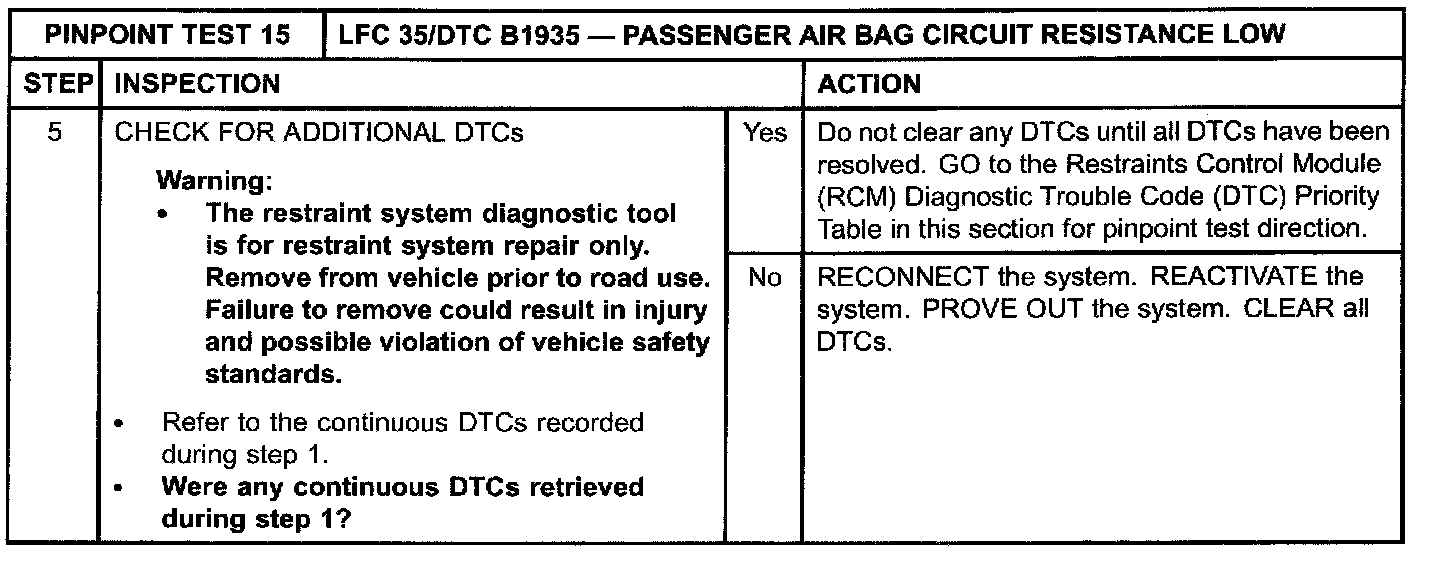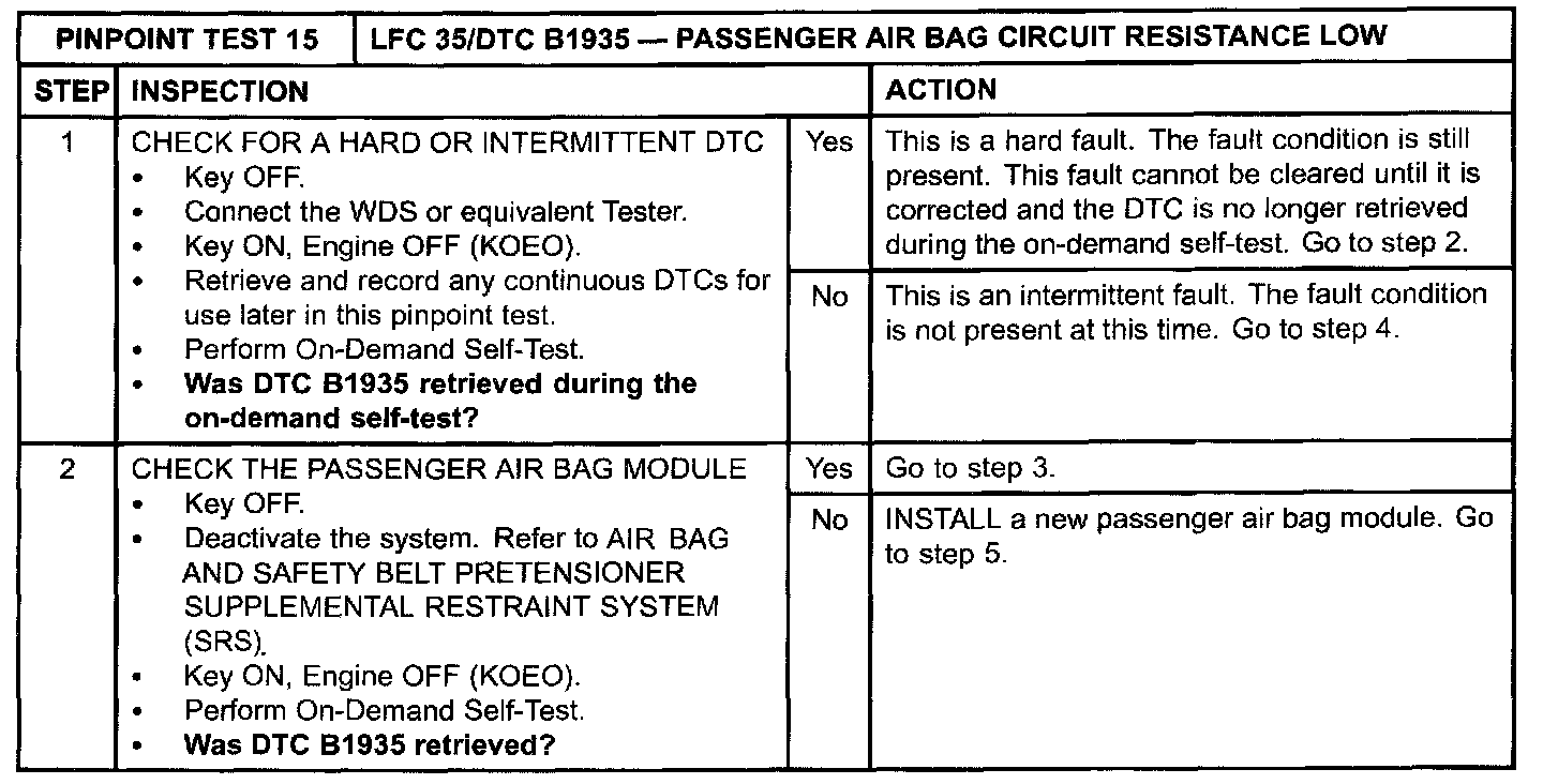 The restraints control module (RCM) monitors the resistance of the passenger air bag ignitor by measuring the resistance between pins 6 and 7. If the RCM detects low resistance between these pins, it will store a diagnostic trouble code (DTC) B1935 in memory and flash a lamp fault code (LFC) 35 (or higher priority code if one exists) on the air bag indicator.