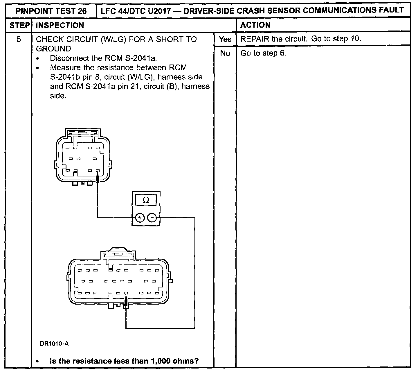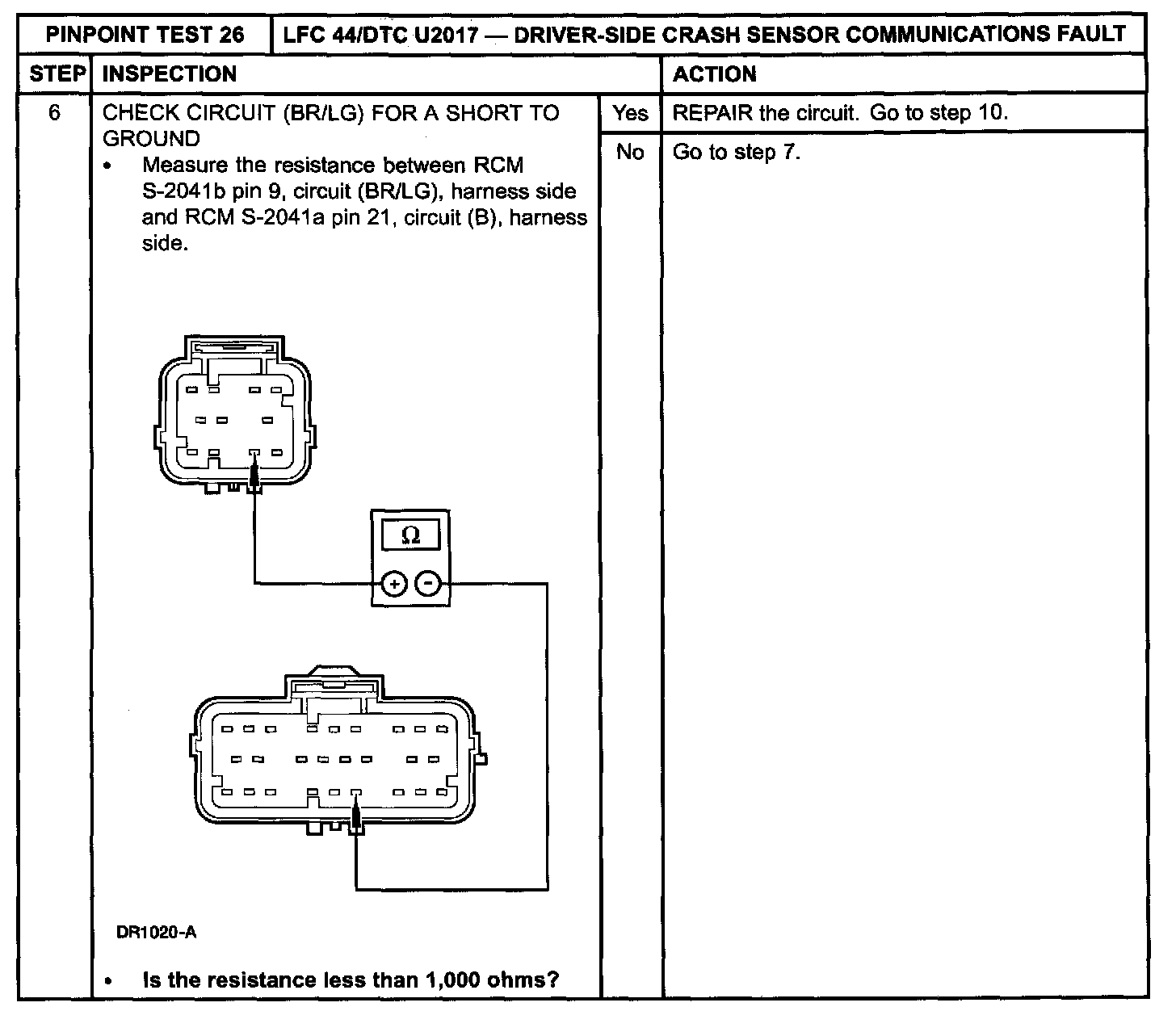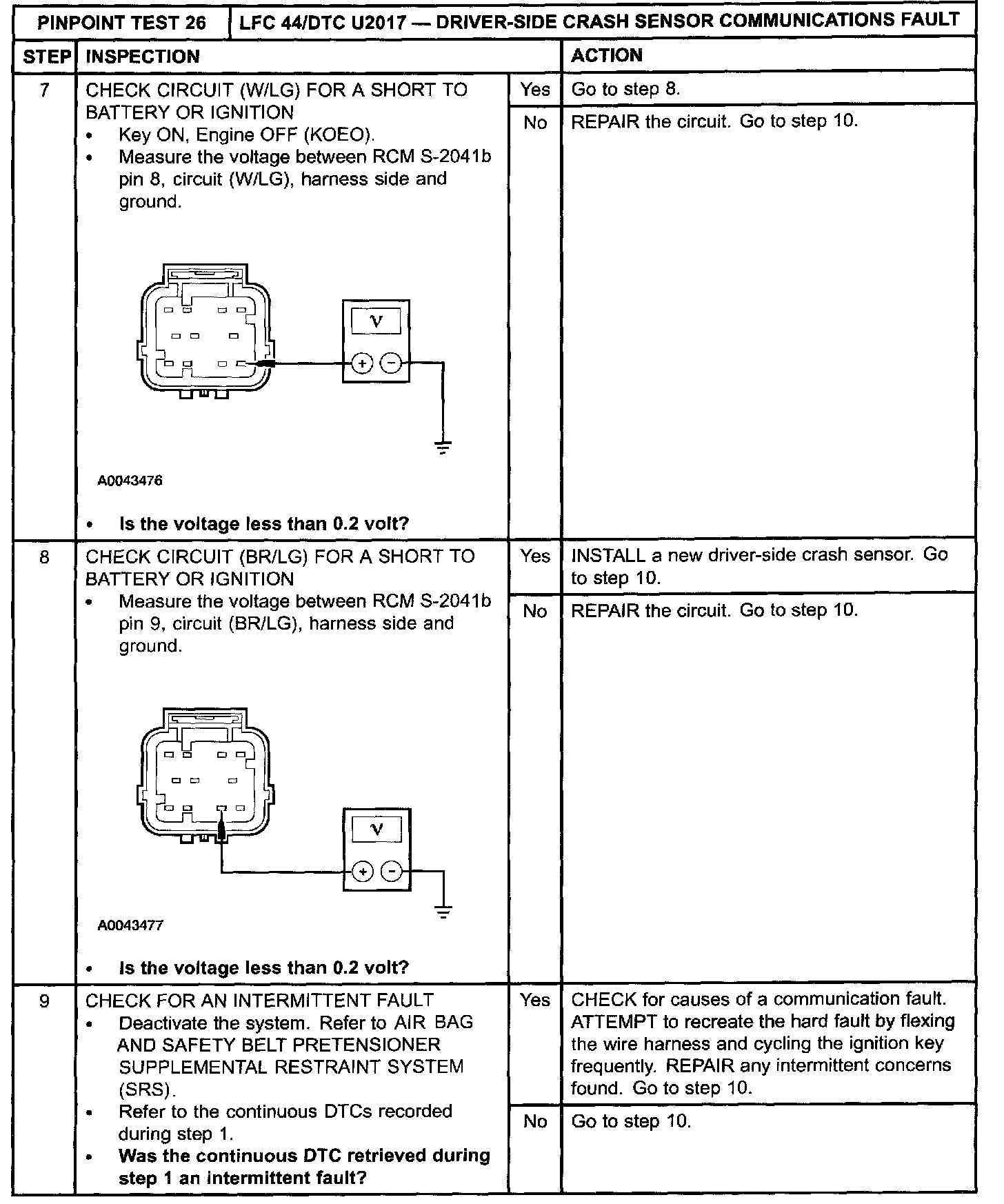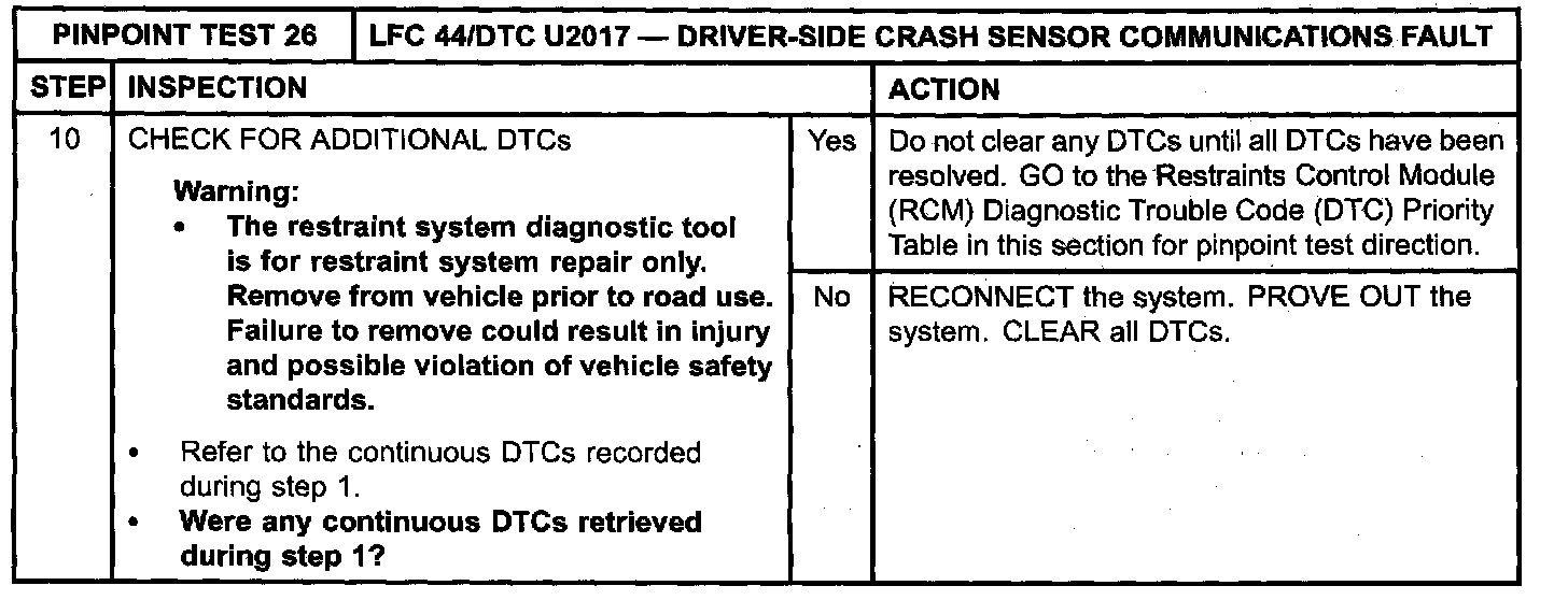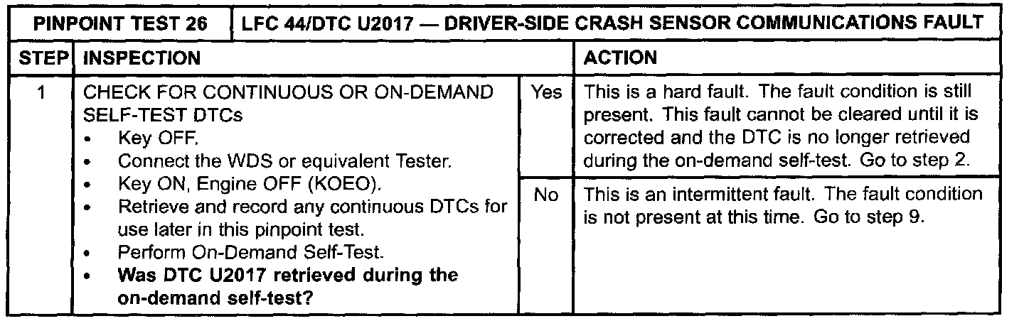 Pinpoint Test 26: LFC 44/DTC U2017 - DRIVER-SIDE CRASH SENSOR COMMUNICATIONS FAULTNormal Operation