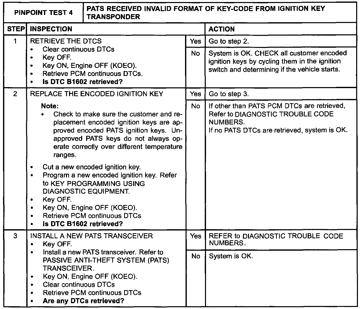 NOTE: Large metallic objects, electronic devices on the key chain that can be used to purchase gasoline or similar items, or a second key on the same key ring as the passive anti-theft system (PATS) ignition key may cause vehicle starting concerns and record DTCs under certain conditions. If a fault cannot be identified, examine the customer's key ring for such objects or devices. If present, inform the customer that they need to keep these objects from touching the PATS ignition key while starting the engine. These objects and devices cannot damage the PATS ignition key, but can cause a momentary problem if they are too close to the key during engine start. If a problem occurs, turn ignition OFF and restart the engine with all other objects on the key ring held away from the ignition key. Check to make sure the encoded ignition key used by the customer is an approved Mazda encoded ignition key.