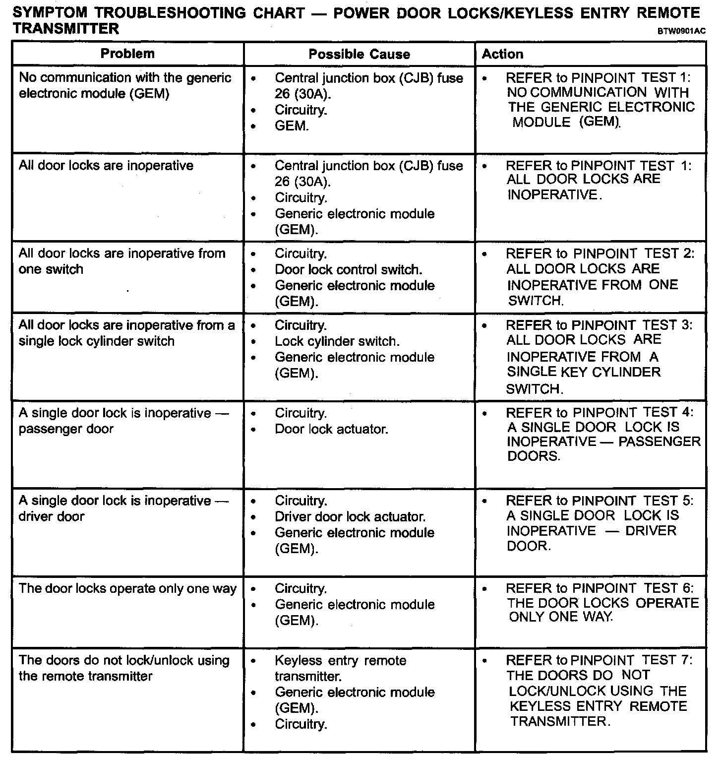 Symptom Troubleshooting Chart - Power Door Locks/keyless Entry Remote Transmitter - Part 2: