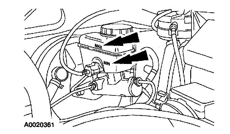 BRAKE SYSTEM LEAK CHECK1. Check the brake fluid level. If the fluid level is below the MIN line on the brake master cylinder reservoir add the necessary amount of DOT 3 brake fluid.