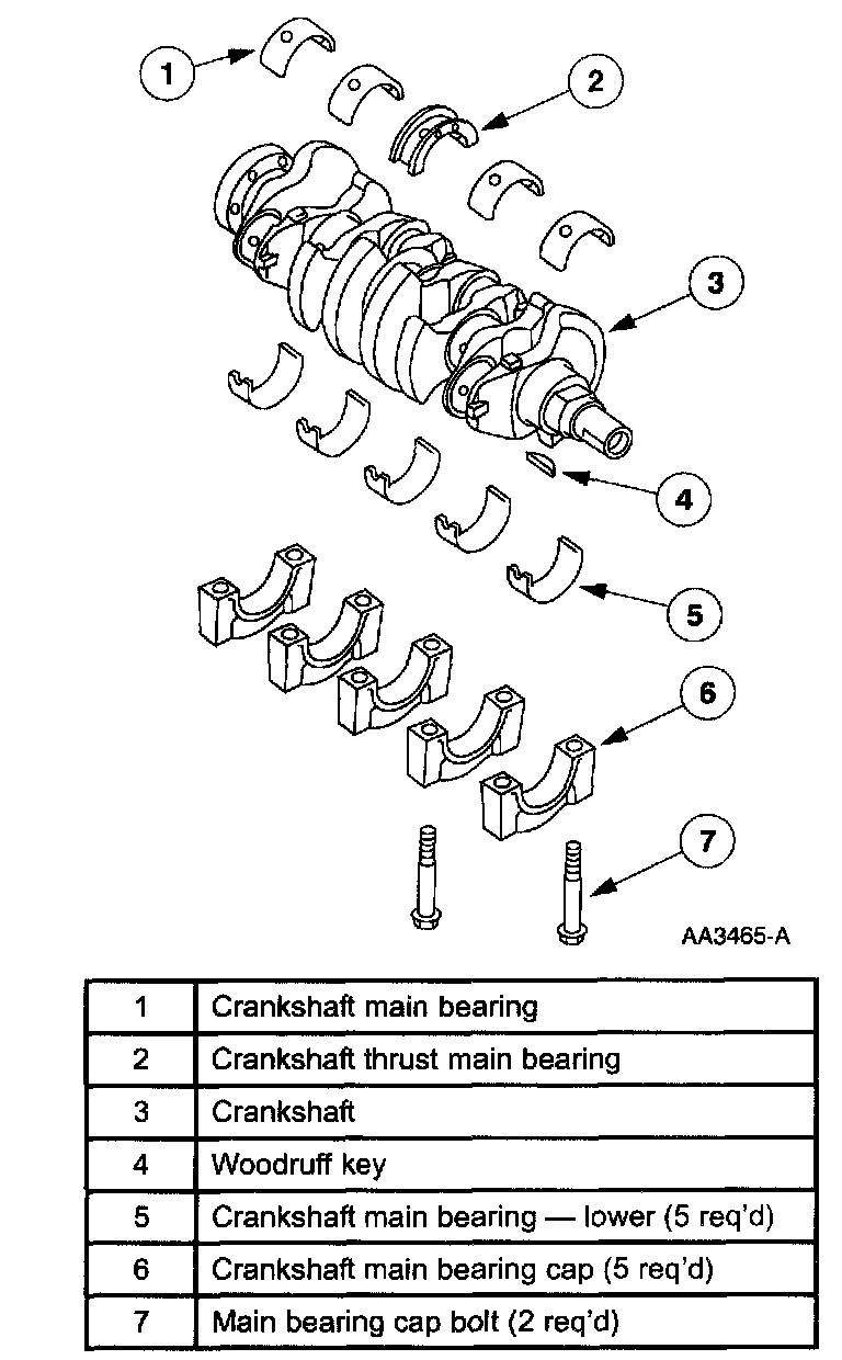 The crankshaft runs on five bearings and has a counterweight for each cylinder. The central main bearing has two bearing half shells which guide the crankshaft along its axis as well as adjusting the end float.