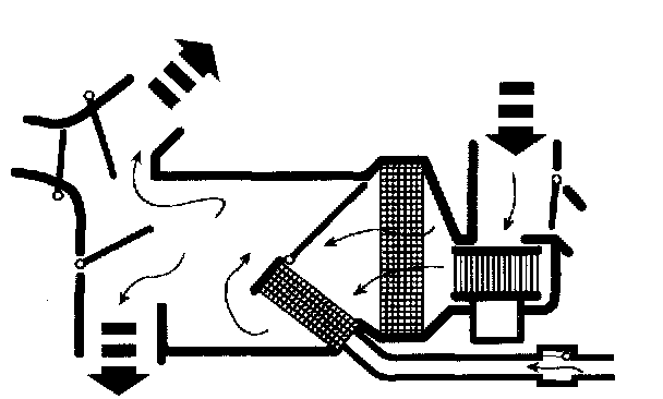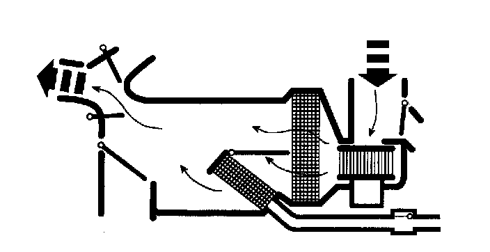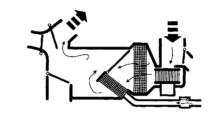 - The air inlet blend door is set at no vacuum, blocking the recirculation passage and admitting outside air.