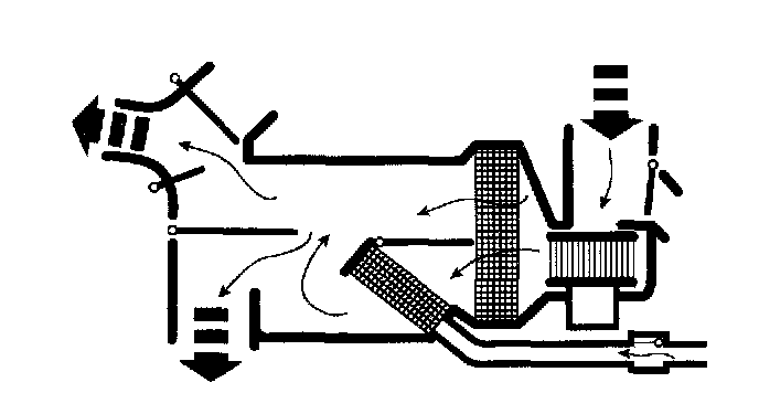 - The air inlet blend door, with no vacuum being applied, blocks recirculated air and allows outside air. Air flows through the system to the driver, passenger and center registers.