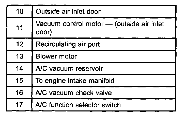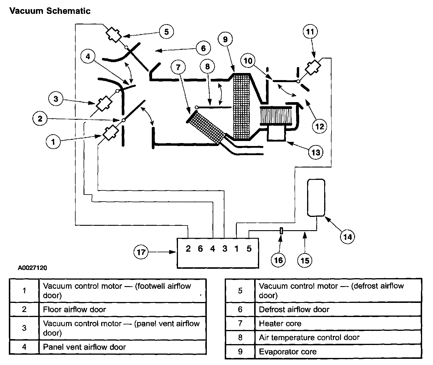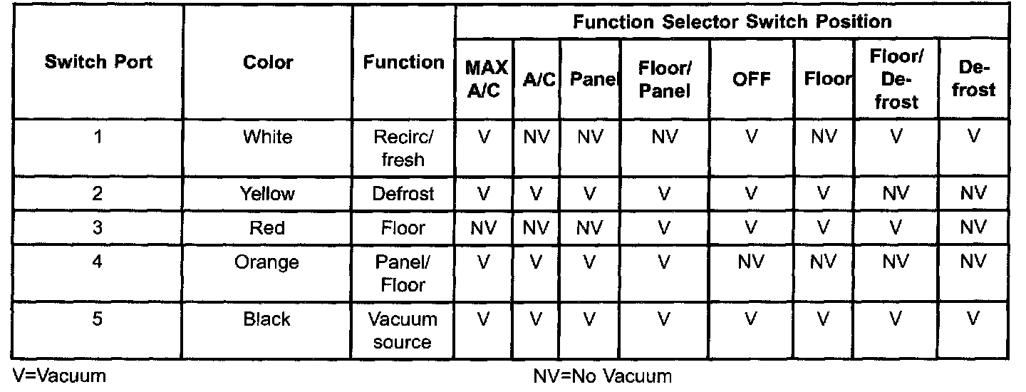 NOTE: A leak in the vacuum control circuits will send all airflow to the defroster outlets. This condition may occur during acceleration indicating a slow leak, exist at all times indicating a large leak, or it may exist only when specific functions are selected indicating a leak in that portion of the circuit.