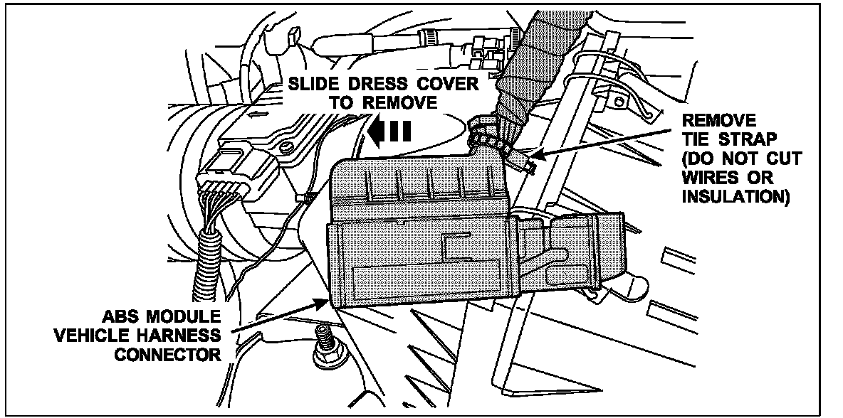 1. Reinstall dress cover and use electrical tape to secure the cover at the same location where the original tie strap was removed. Apply dielectric grease to the ABS module connector, position and connect the harness as follows: