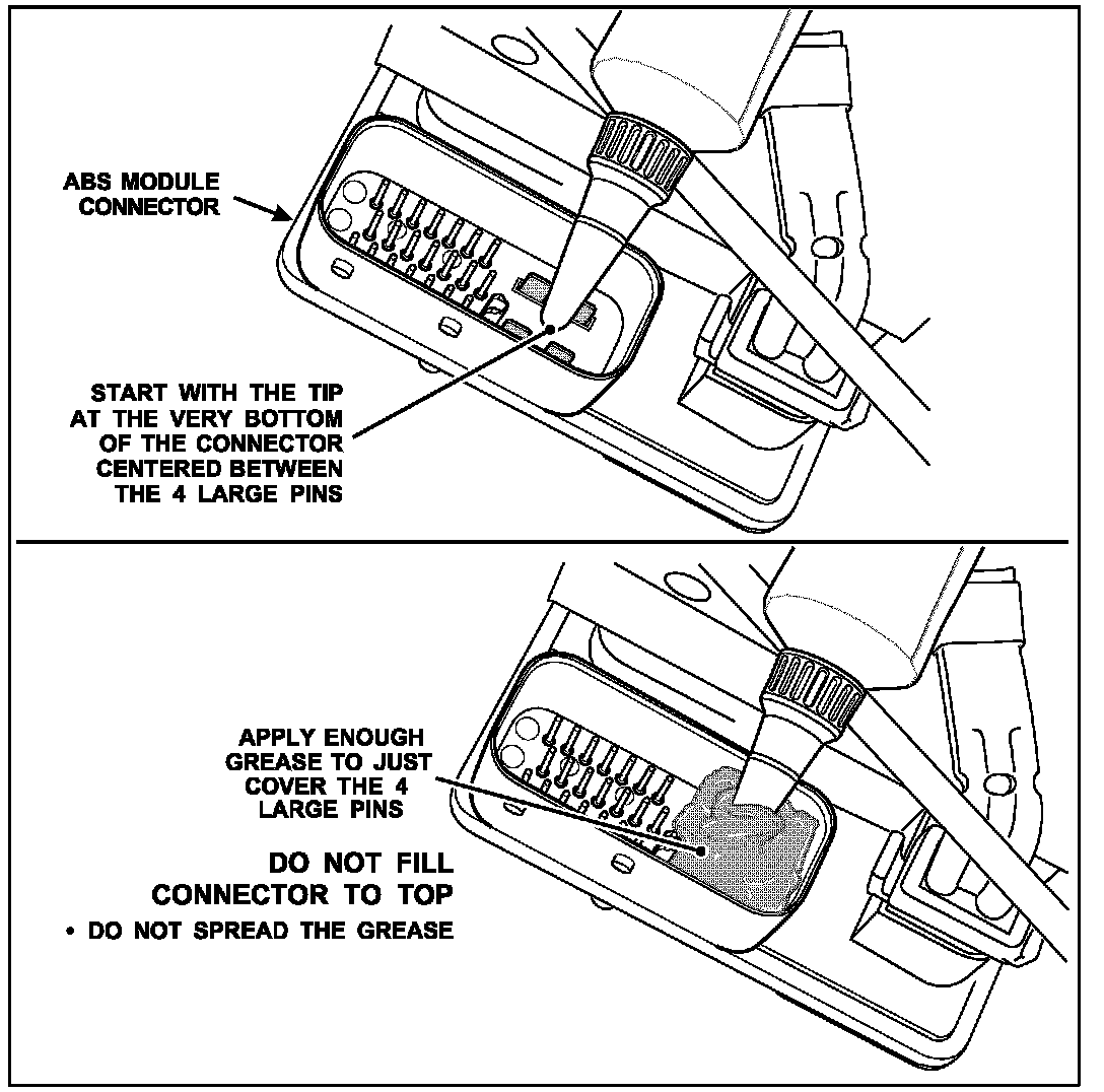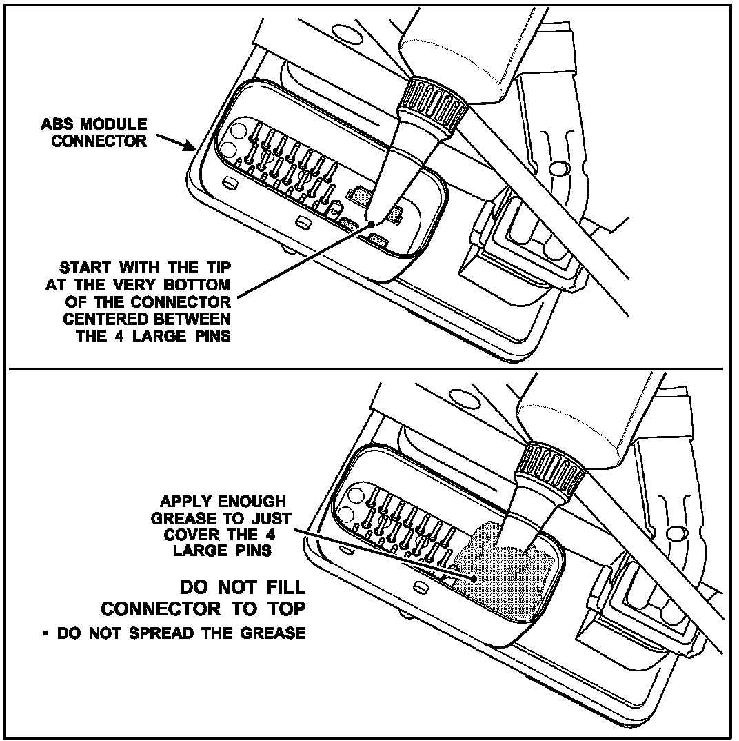 ^ With the tip of the applicator tube snipped off, position the end of the tip between the four (4) large flat pins at the bottom of the ABS module connector. Squeeze out enough grease to completely cover the four (4) flat pins.