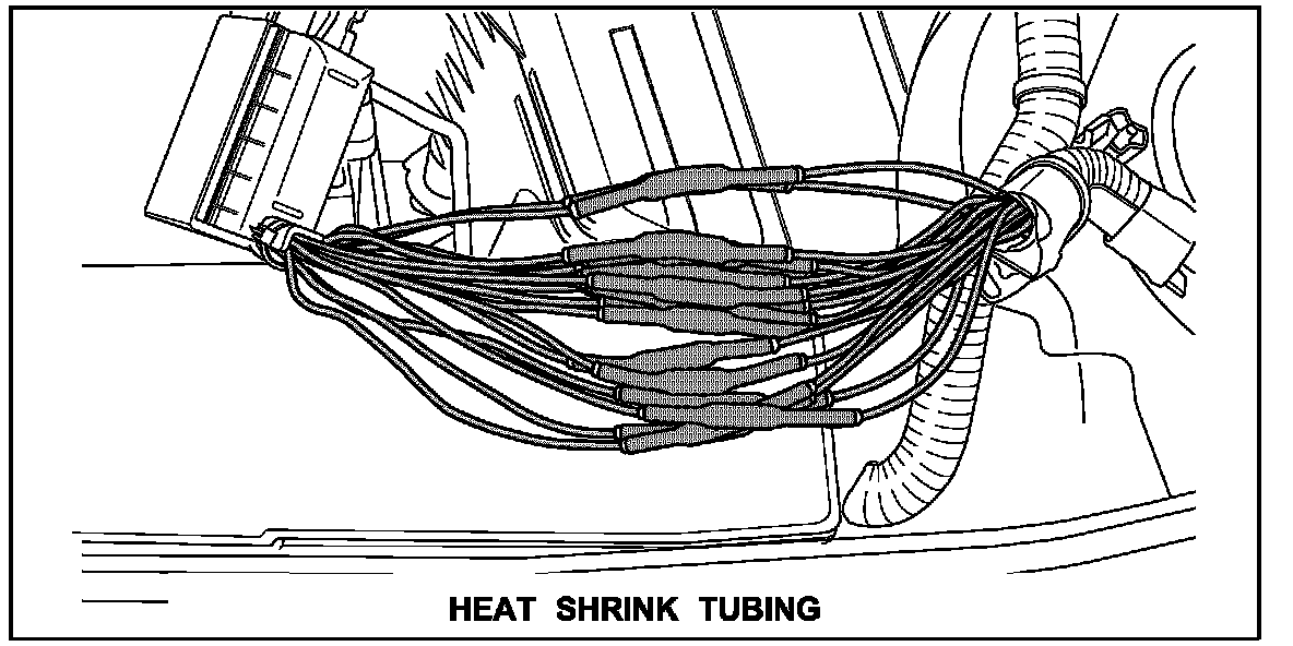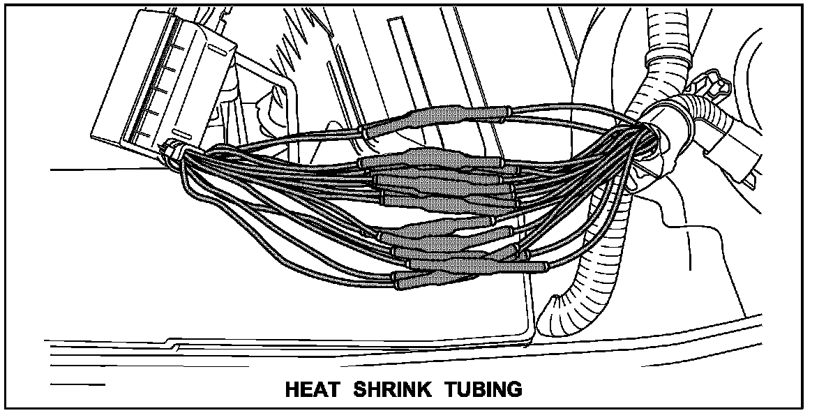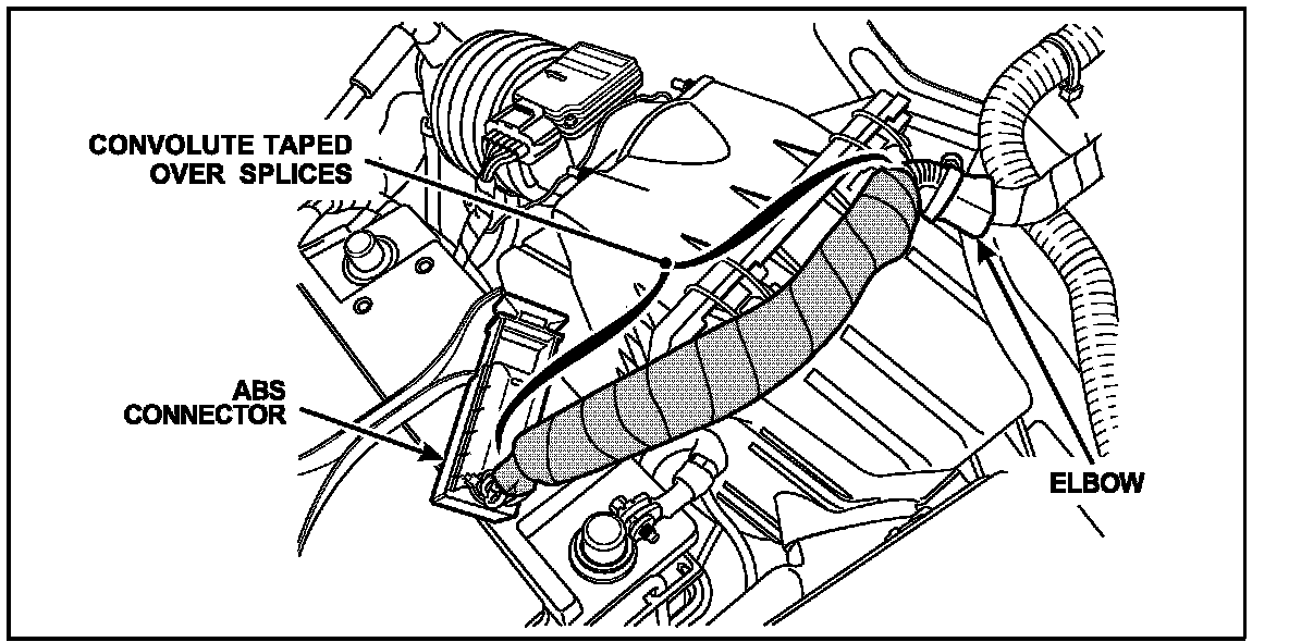 1. Remove the tape and the convolute from the vehicle harness from the ABS module connector to 90 degree harness "elbow".