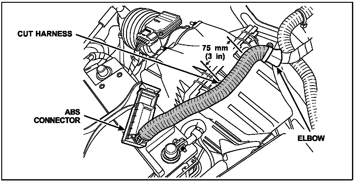 2. Measure 75 mm (approximately 3 in) from the end of the elbow towards the ABS module connector, then using suitable wire cutters, cut the