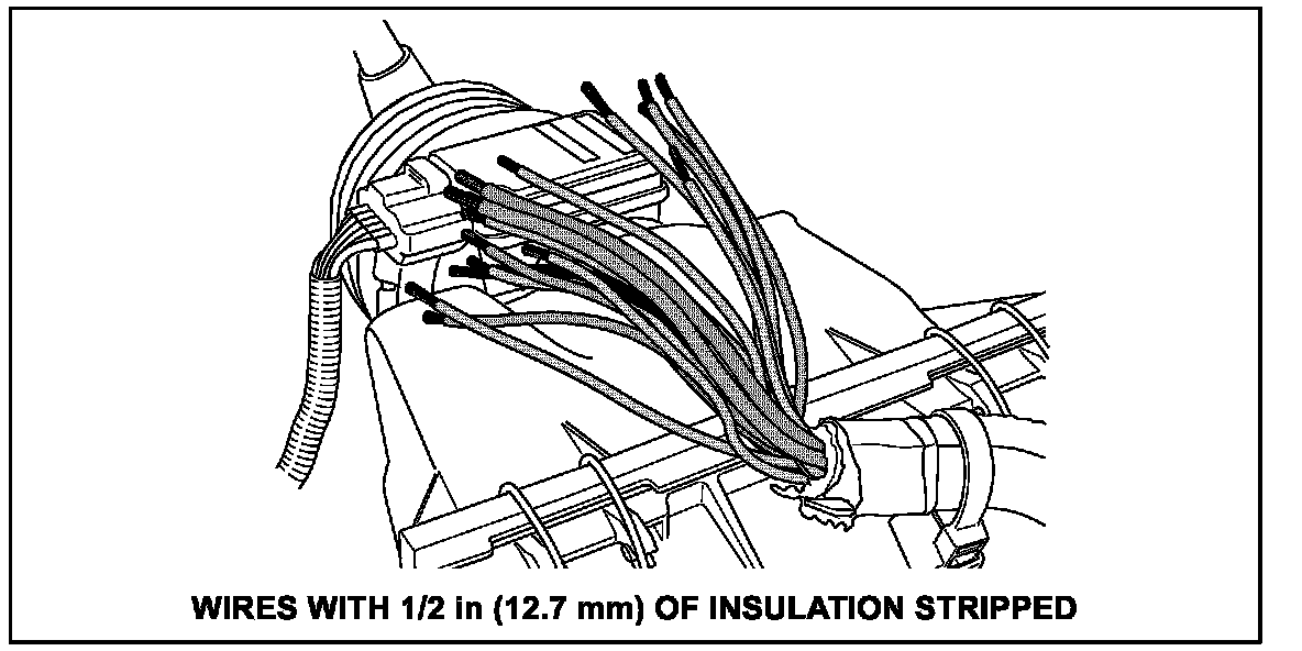 3. Strip approximately 1/2 in. (12.7 mm) of insulation from each of the cut wires in the harness.