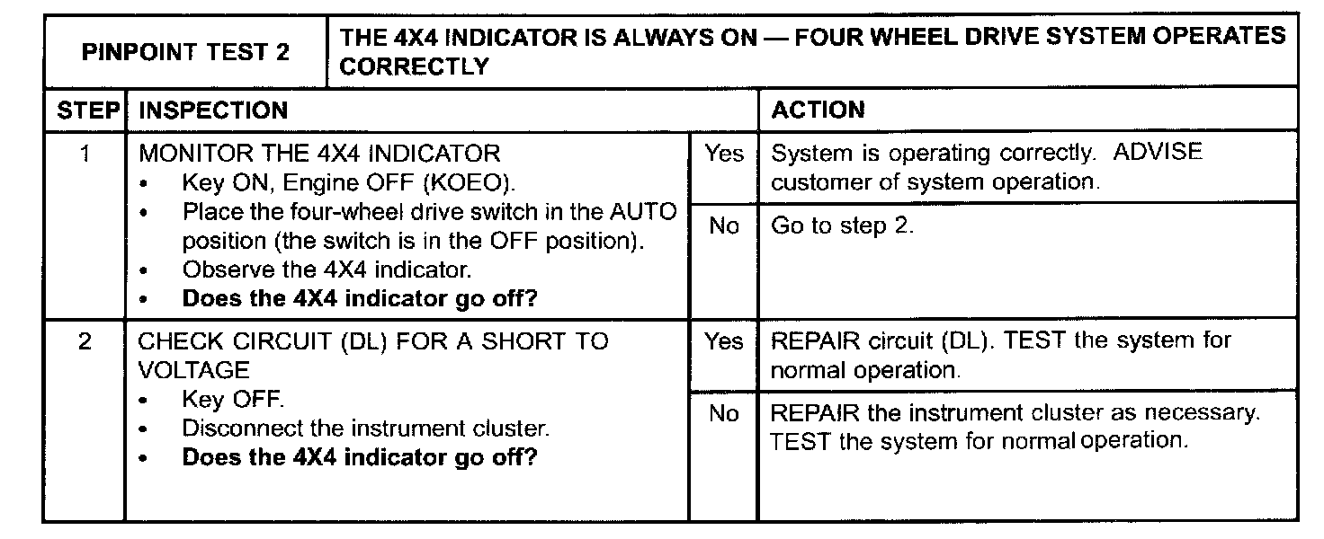 PINPOINT TEST 2: THE 4X4 INDICATOR IS ALWAYS ON-FOUR WHEEL DRIVE SYSTEM OPERATES CORRECTLY