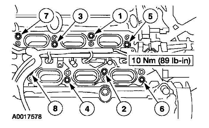 4. Install the lower intake manifold assembly and tighten the bolts in the sequence shown.