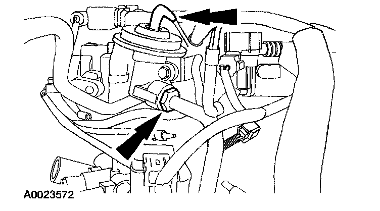 5. Disconnect the exhaust gas recirculation (EGR) valve vacuum hose and EGR tube nut.