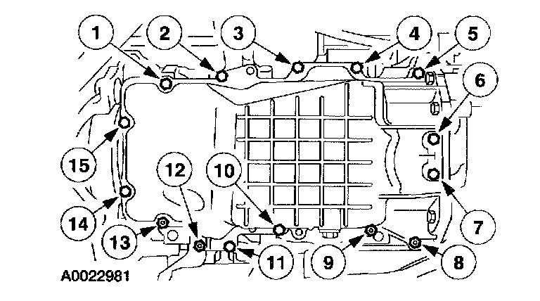 61. Tighten the oil pan bolts and studs in the sequence shown.