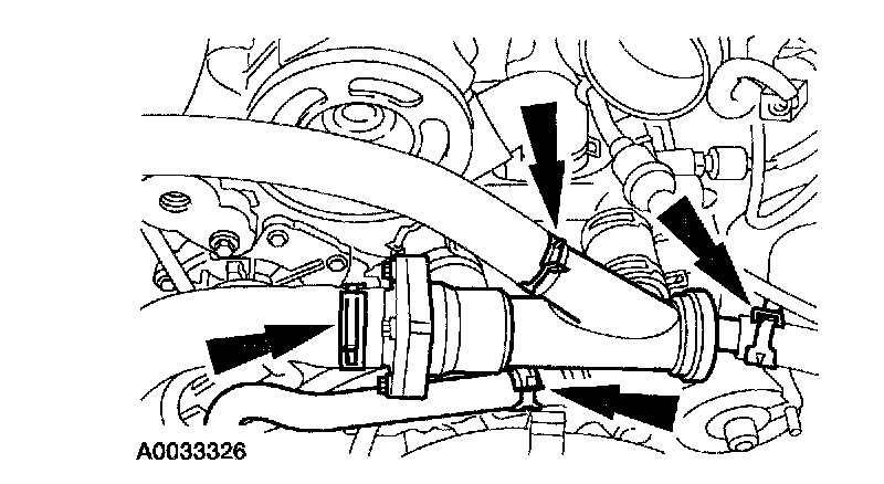 54. Position the thermostat housing and connect the five hoses.