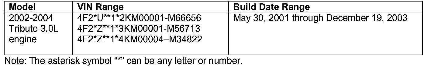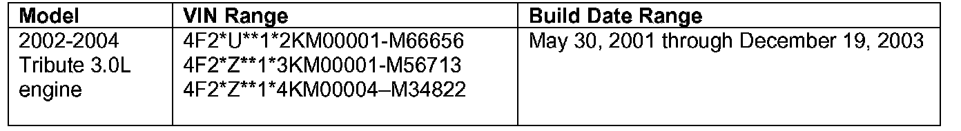 CONDITION OF CONCERNOn certain 2002-2004 Tribute vehicles equipped with 3.0-liter engines, the accelerator cable may prevent the throttle from returning to the idle position, possibly resulting in elevated engine speeds while driving. An unexpected increase in engine idle speed may increase stopping distance and may result in a vehicle crash without warning.