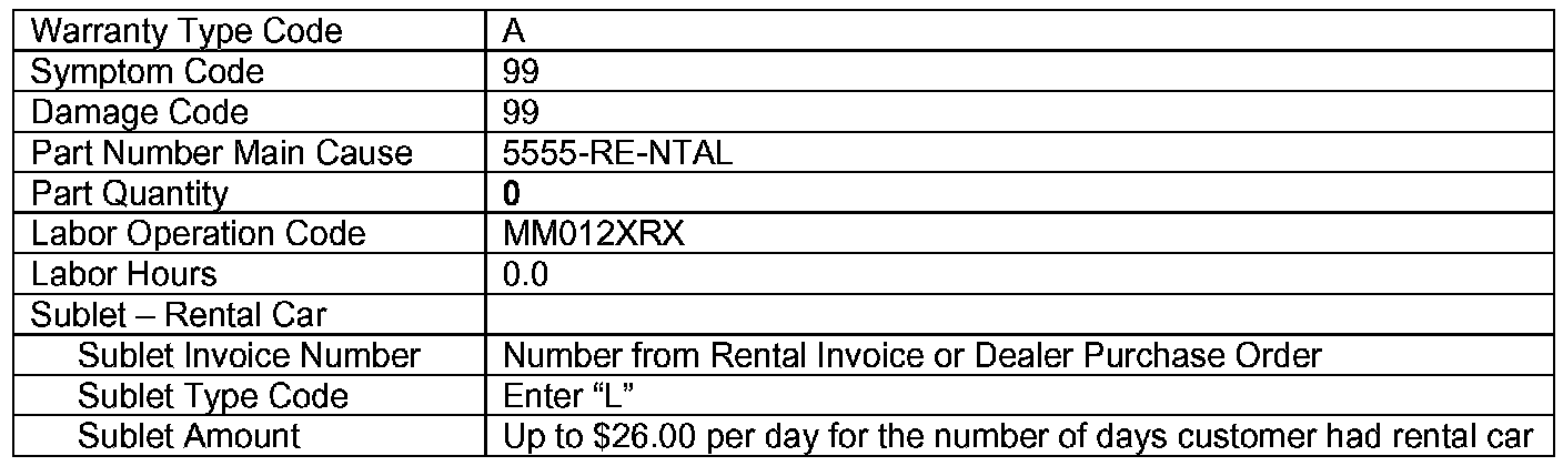 A rental car may be provided to the customer if eligible based on the terms and conditions of the Rental Car Reimbursement Program, policy 12.0. Rental car reimbursements are available only on 2001 and newer vehicles within the mileage and time limitations under the New Vehicle Limited Warranty. If the customer was placed in a rental car while the campaign was being completed and the vehicle is not within the mileage and time limitations, you must obtain authorization for the rental. Submit a separate claim/problem using the standard rental claim information.