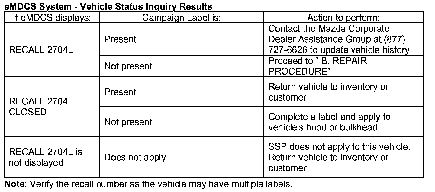 2. Perform a Warranty Vehicle Inquiry using your eMDCS System and inspect vehicle for an Authorized Modification Label RECALL 2704L attached to the vehicle's bulkhead.