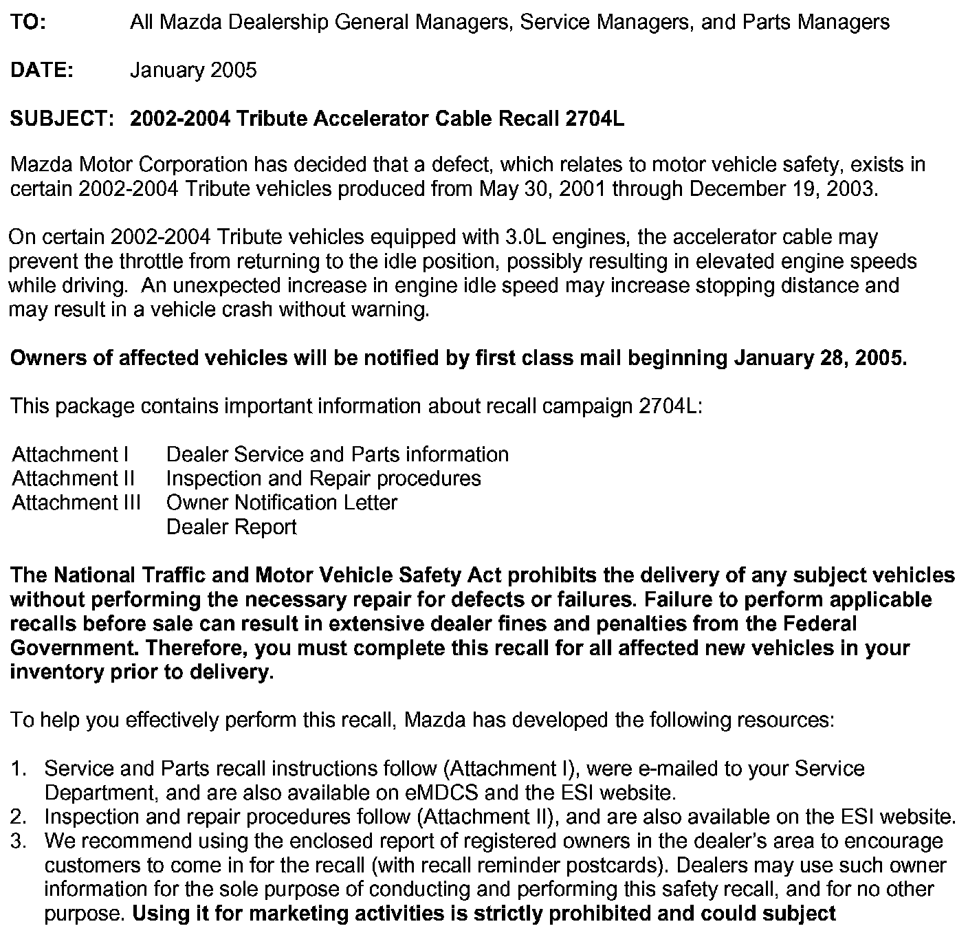 Recall - Accelerator Cable Replacement