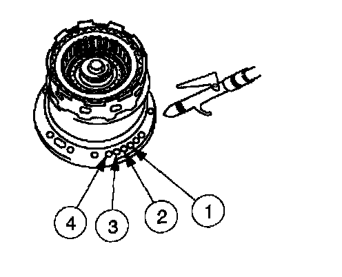 12. Check the following passages of the forward/coast/direct clutch cylinder and reverse clutch drum with moisture-free compressed air, regulated to 276 kPa (40 psi).