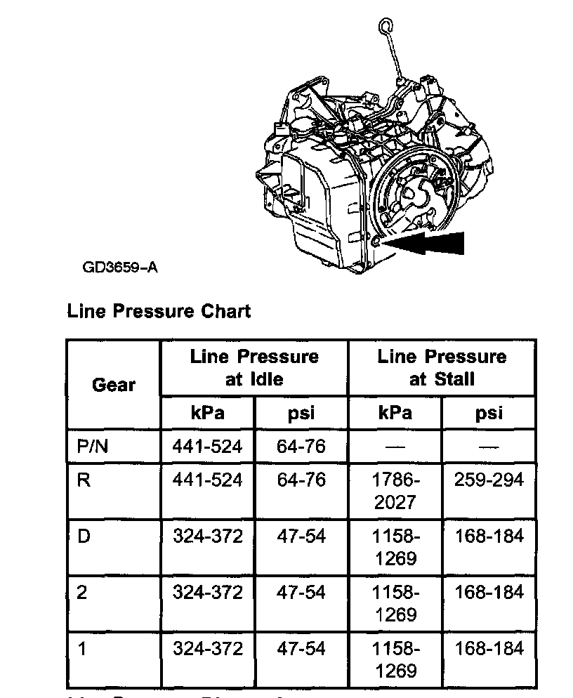 2. Start engine and check line pressures. Refer to Line Pressure Chart 401 to determine if line pressure is within specifications.
