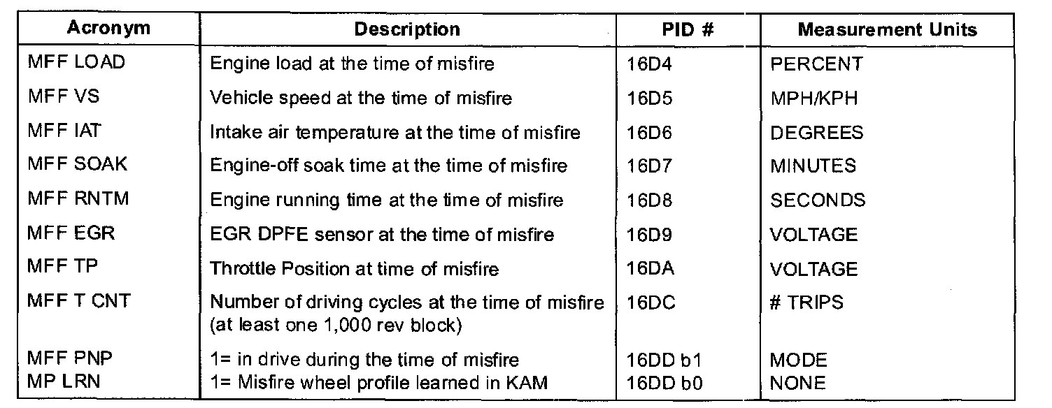 Some unique parameters (PIDs) are stored in the Keep Alive Memory of the PCM to help in diagnosing the root cause of misfires. These PIDs are collectively called misfire freeze-frame (MFF) data. These parameters are separate from the generic freeze-frame data that is stored for every MIL code. They are used for misfire diagnosis only. The MFF data is more useful for misfire diagnosis than the normal diagnosis only. It is captured at the time of the highest misfire rate and not when the DTC is stored at the end of a 1000 or 200 revolution block (Generic freeze-frame data for misfire can be stored minutes after the misfire actually occurred).
