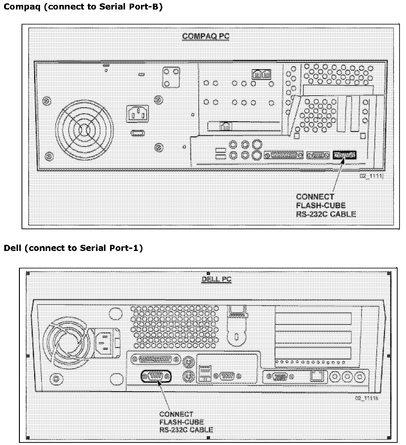 3. Connect RS-232C cable to the Serial port (often identified with IOIOI) on the back of the PC. Use the figures shown for the type of PC you have (due to the many different PC configurations, your PC may not match these figures exactly).