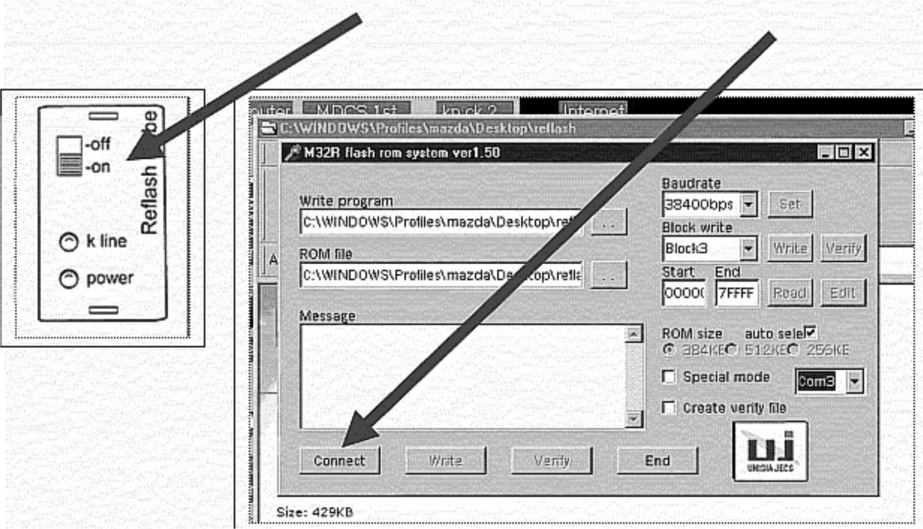 If you receive an error message for every corn port (Com1, Com2, Com3, or Com4), shut off the reflash cube and shut down the PC. Make sure the reflash cube is plugged in securely (or if there are 2 serial ports, try plugging into the other one) and restart the PC and try again. If all the com ports still give an error message, there may be a hardware configuration problem with the PC. Have a computer specialist inspect and repair the PC. Try to perform the procedure using another PC.