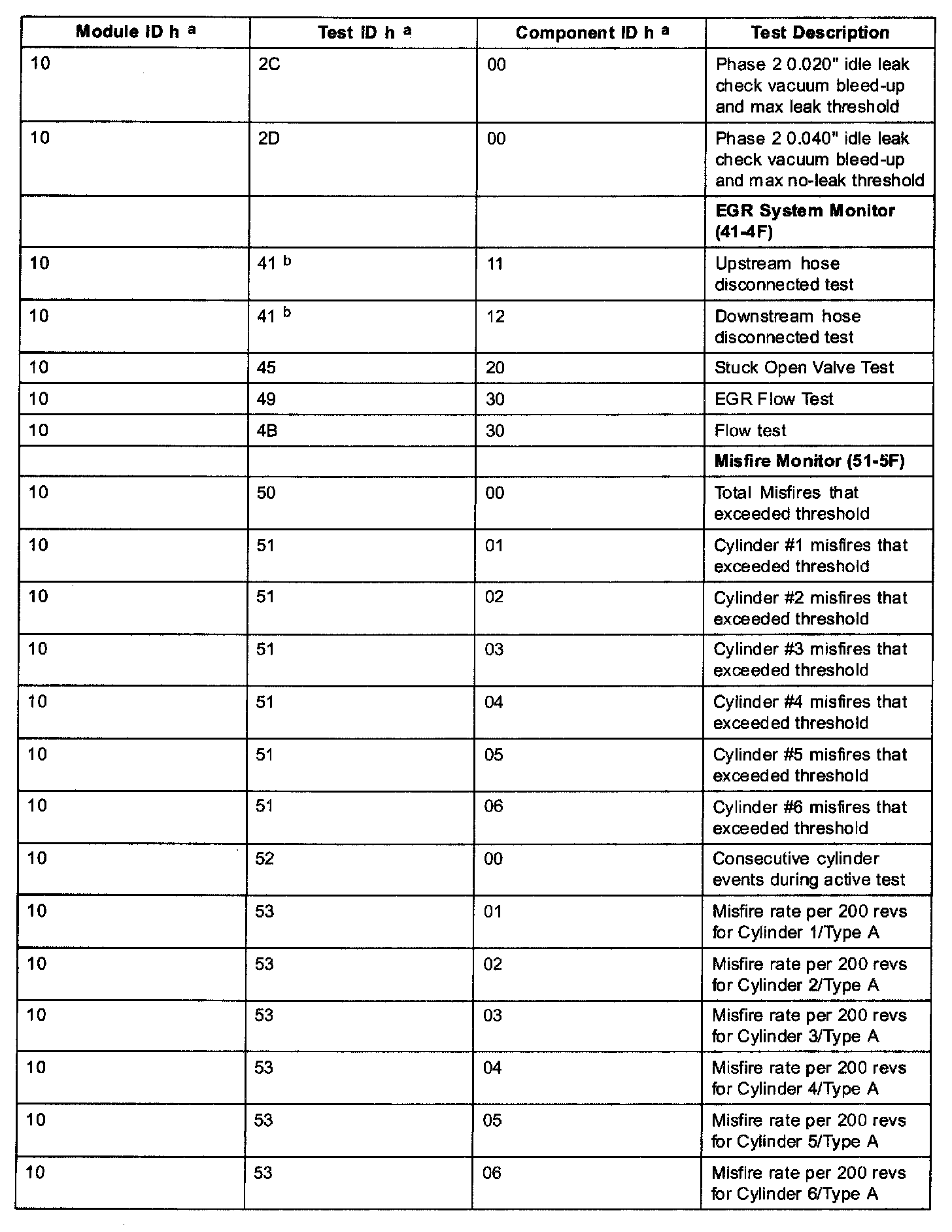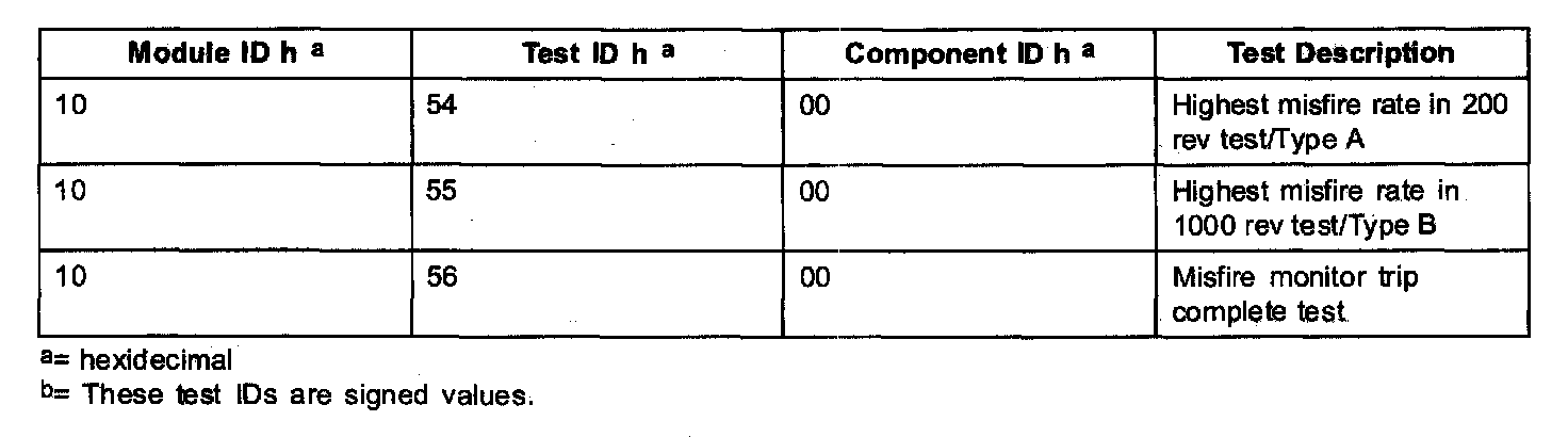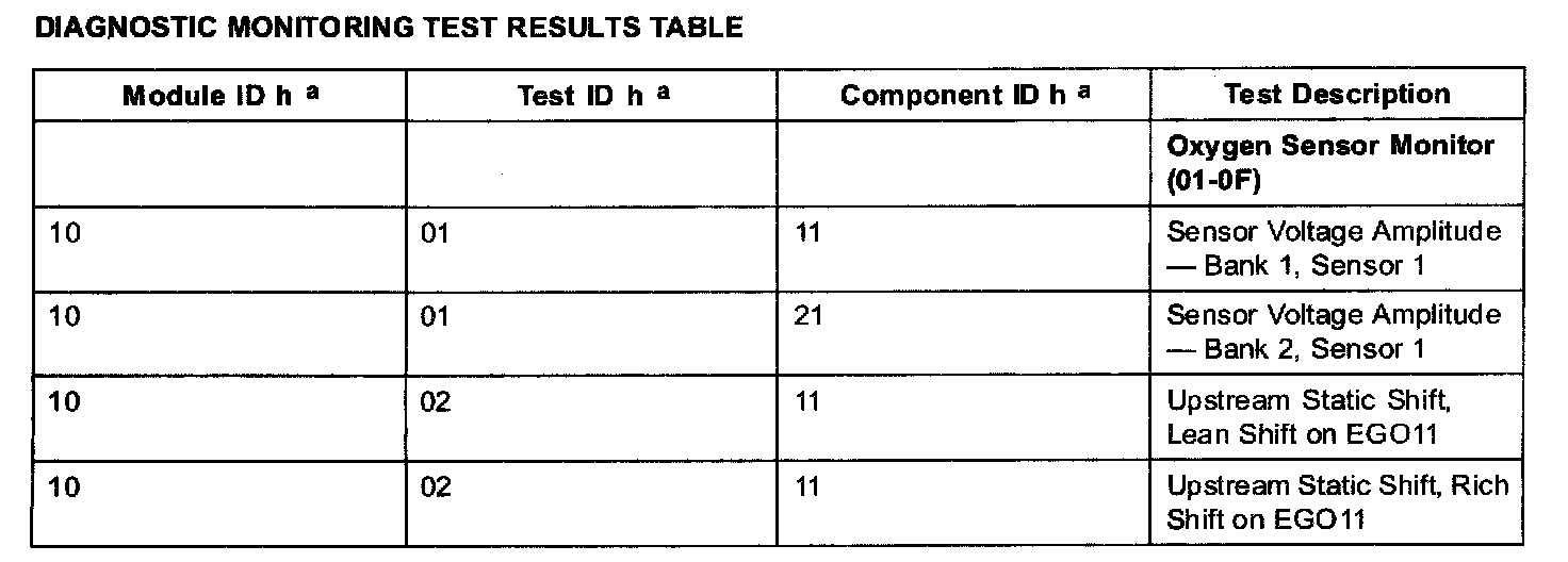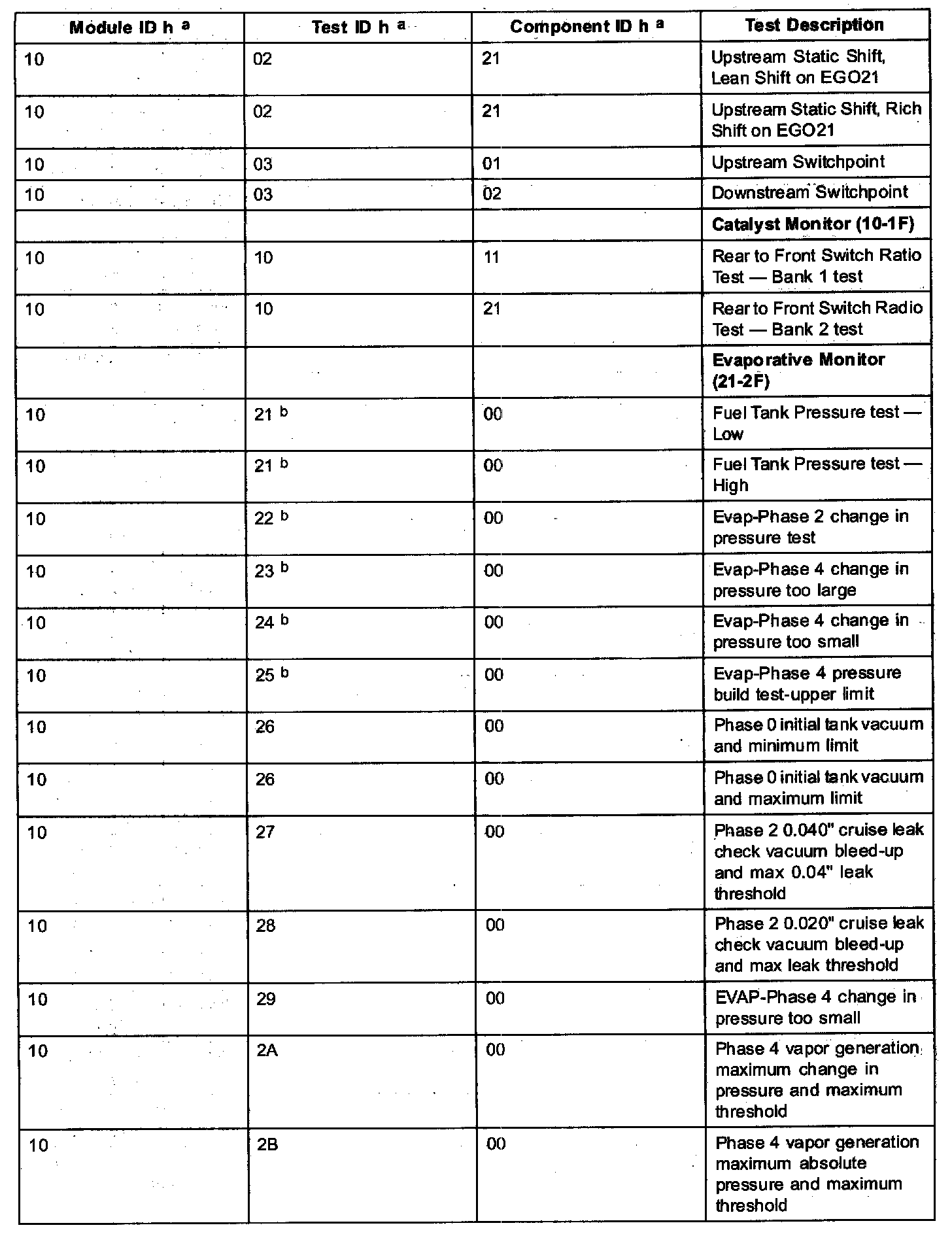 The purpose of this test mode is to allow access to the results of OBD II monitor diagnostic test results. The test values that are stored at the time of the particular monitor completion are displayed when the particular test identification is requested. See the given table for test information.