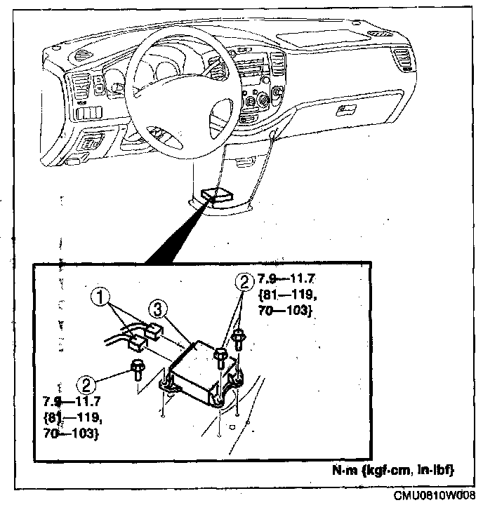 SAS CONTROL MODULE REMOVAL/INSTALLATION [TWO-STEP DEPLOYMENT CONTROL SYSTEM]WARNING: Handling the SAS control module improperly can accidentally deploy the air bag modules and pre-tensioner seat belt, which may seriously injure you. Read the service warnings and cautions before handling the air bag module.