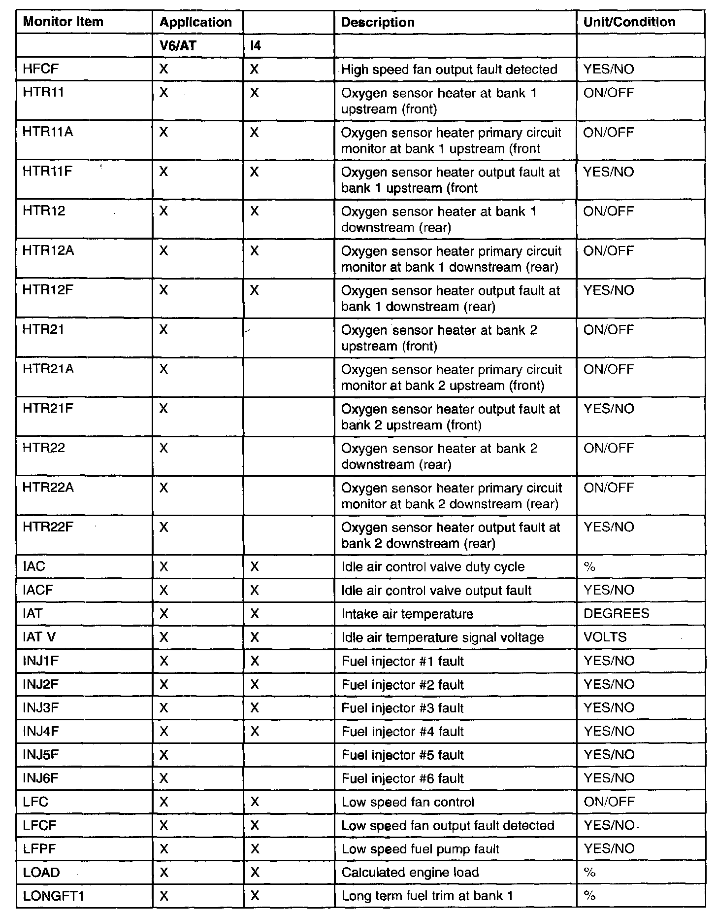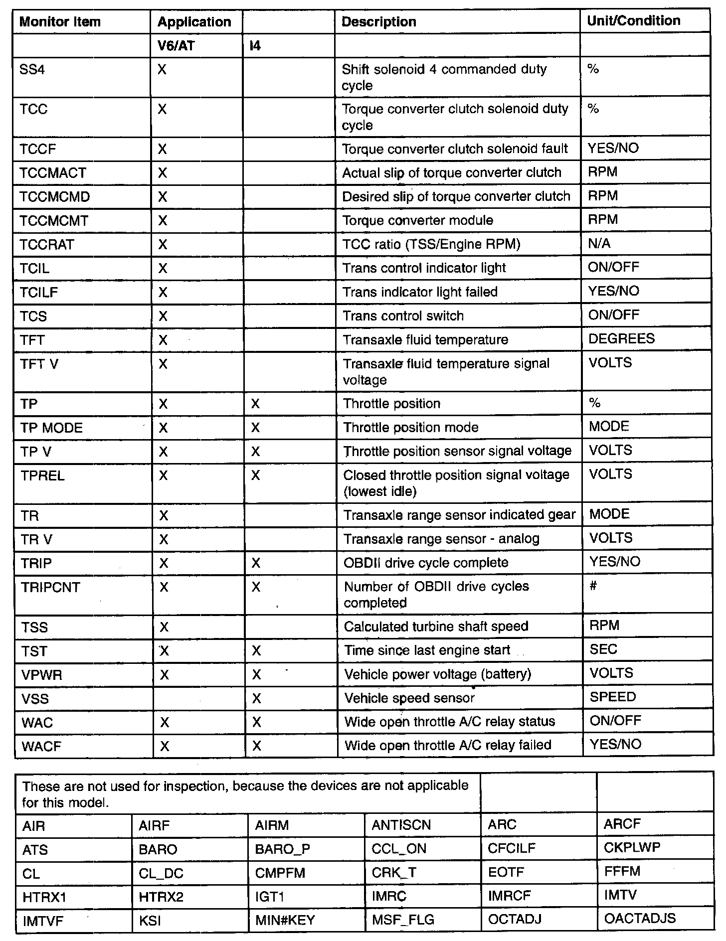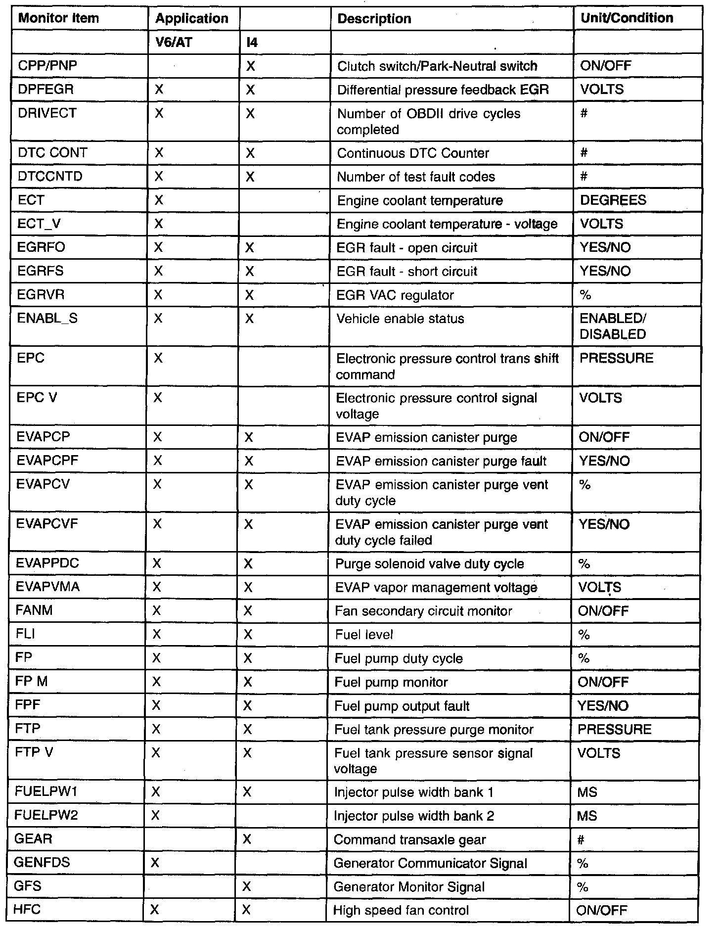 PID/DATA Monitor Item Table (Part 4):